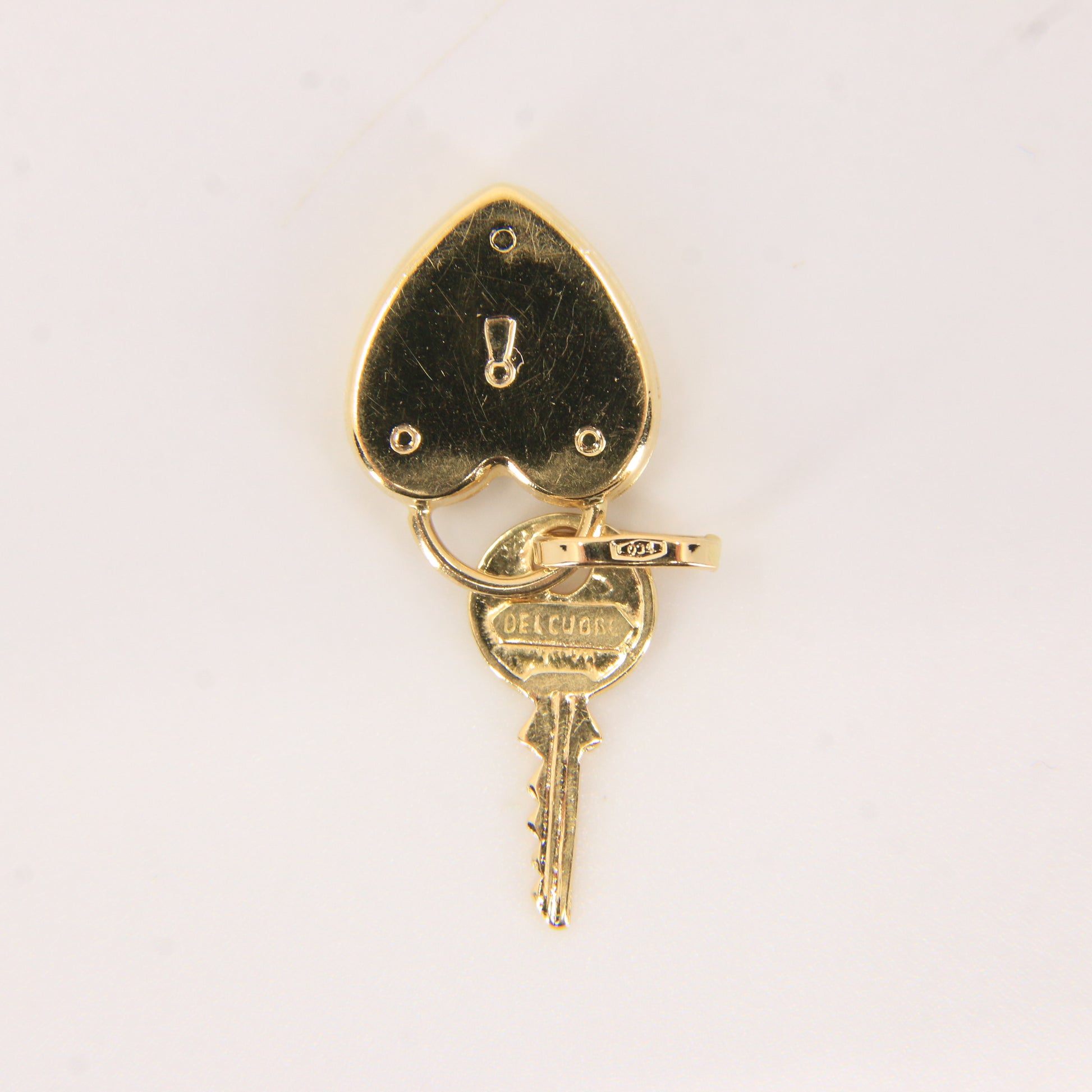 A romantic vintage 18k yellow gold heart and key charm engraved “Del Cuore,” meaning “of the heart.” Finely made in Italy, this solid gold pendant symbolises love and devotion — perfect as a thoughtful gold gift or collector’s piece.