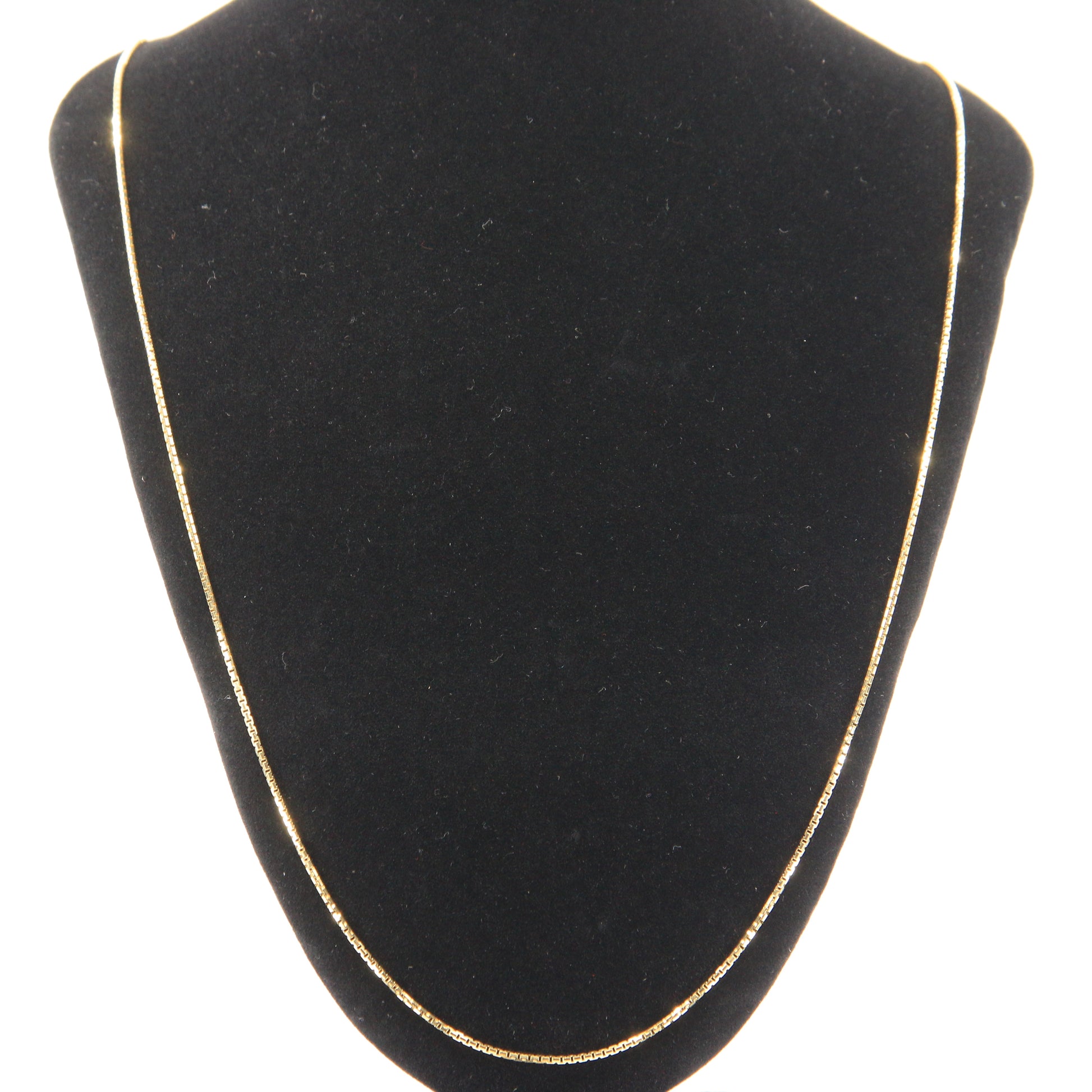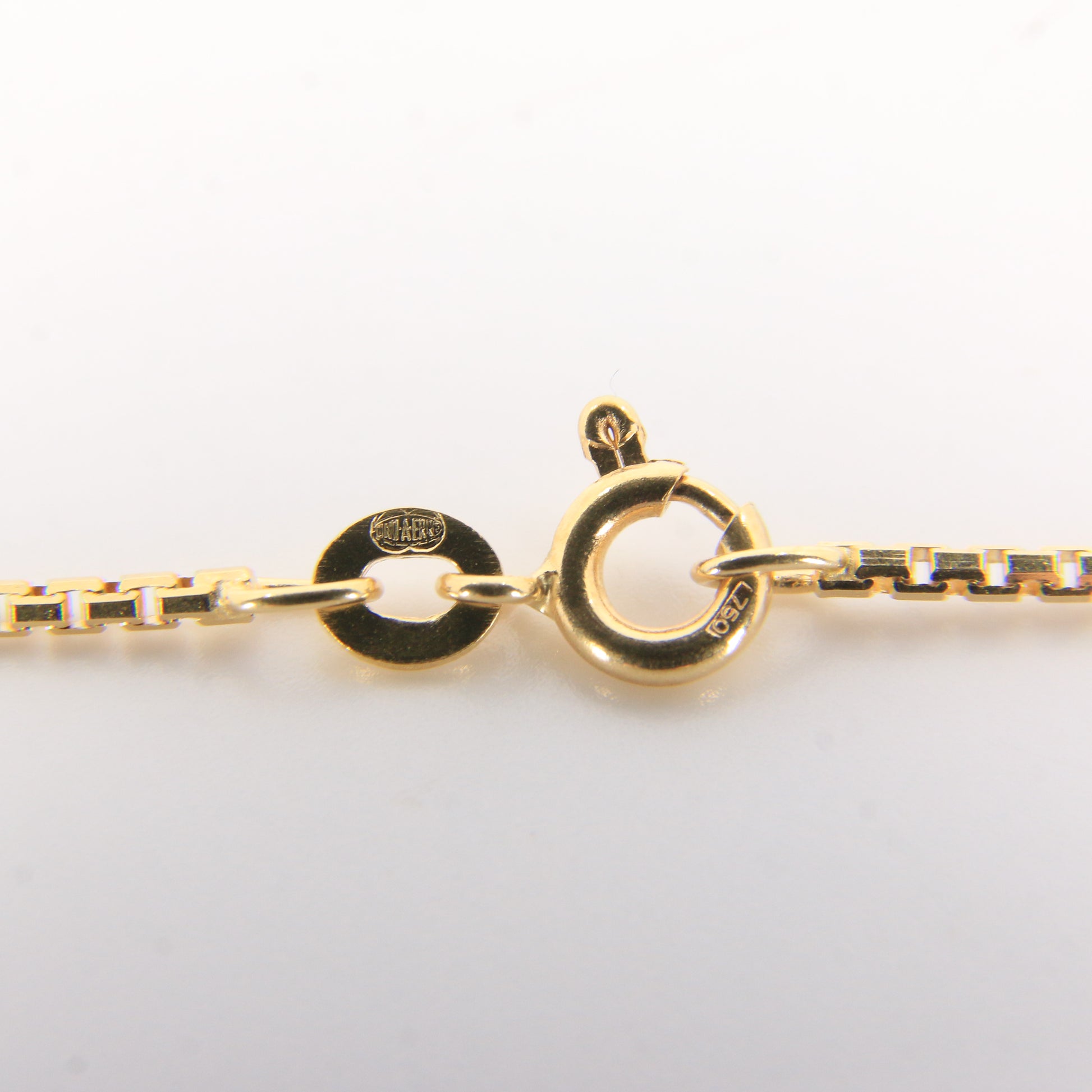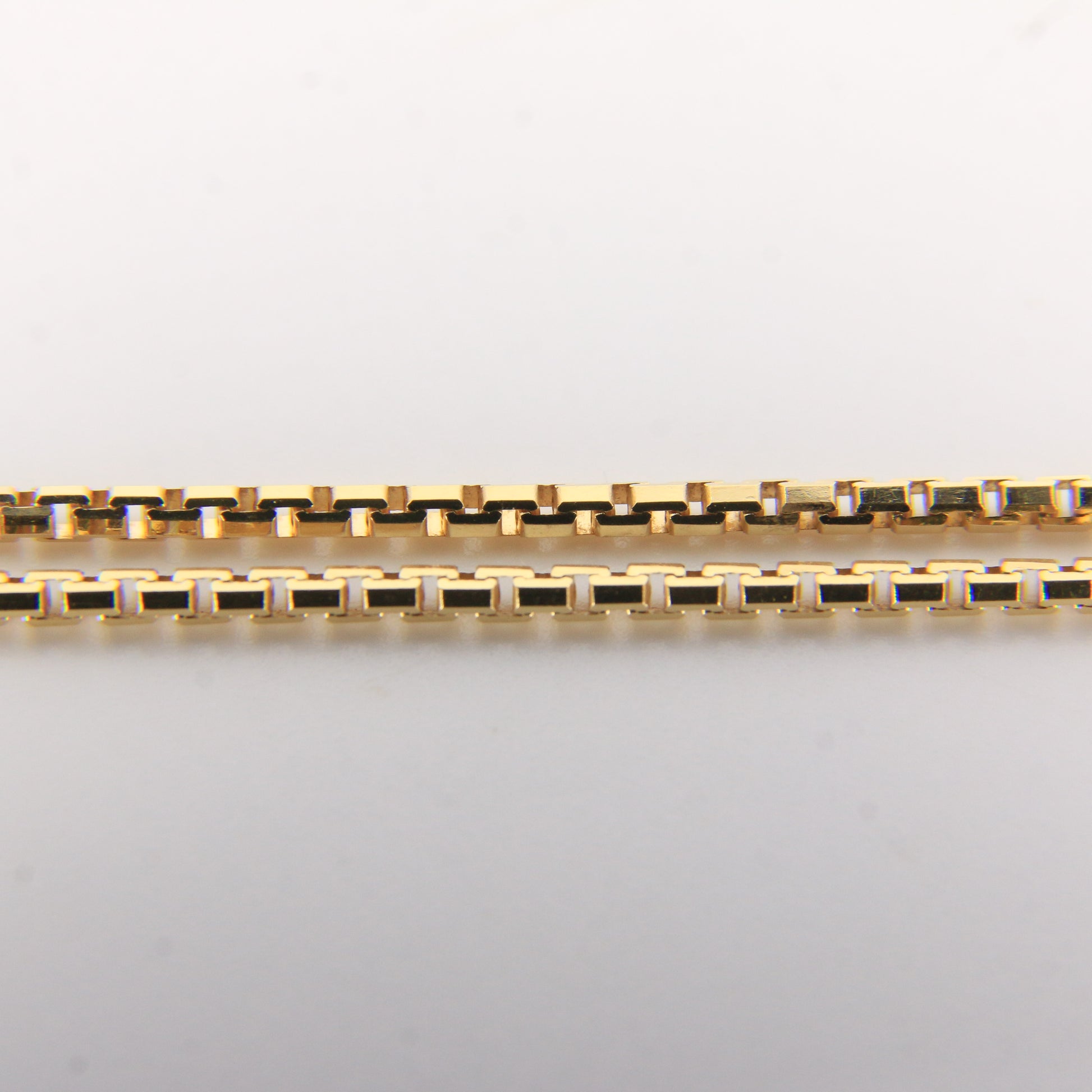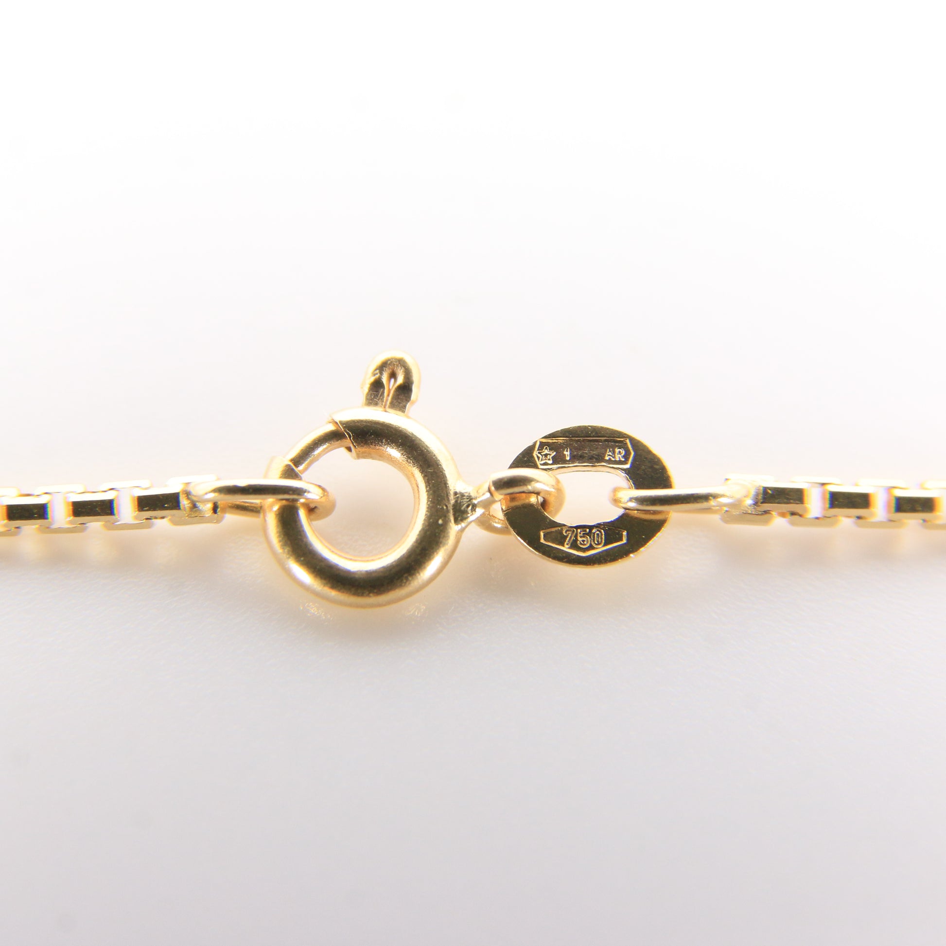 A vintage 18k yellow gold box chain necklace by Italian maker Unoaerre, measuring 27 inches with a fine 1.3 mm profile and presented boxed. Box chains are valued for their clean geometry and strength—add this refined gold necklace to your collection today.
