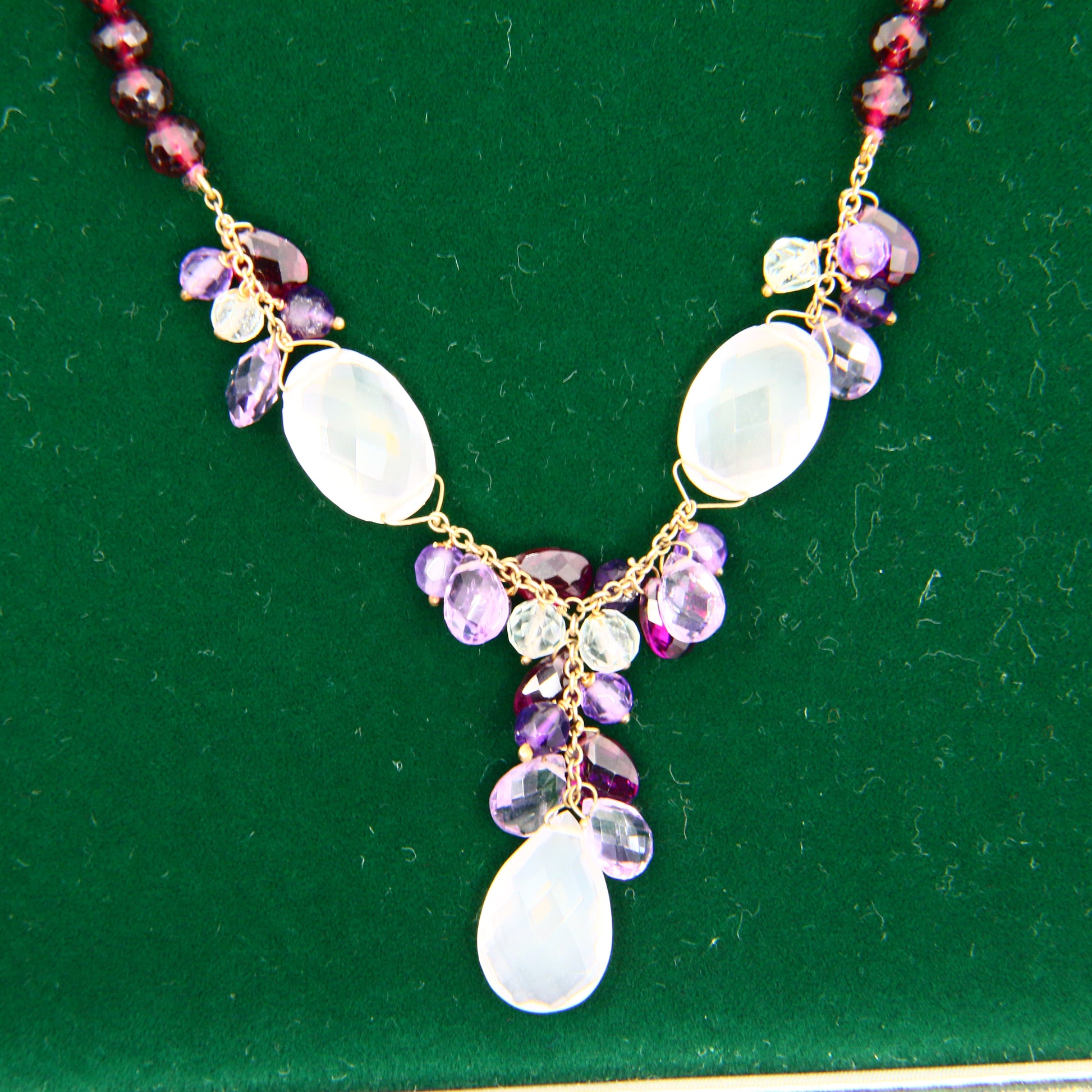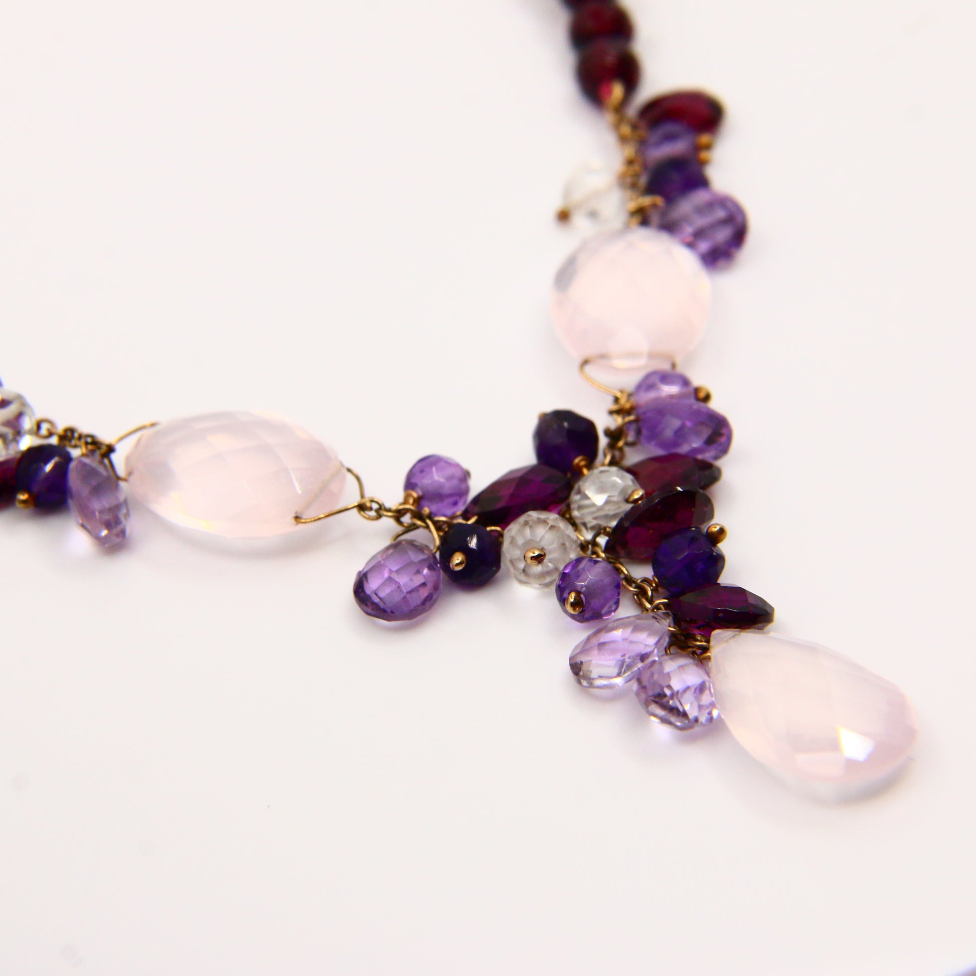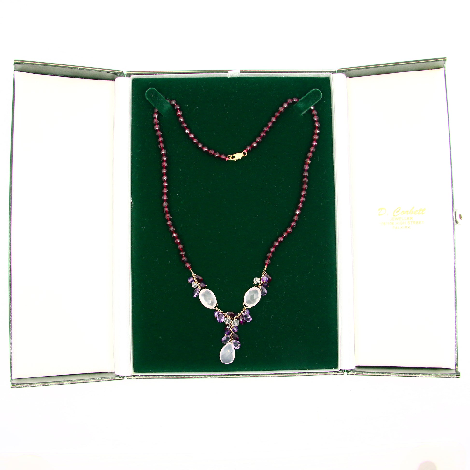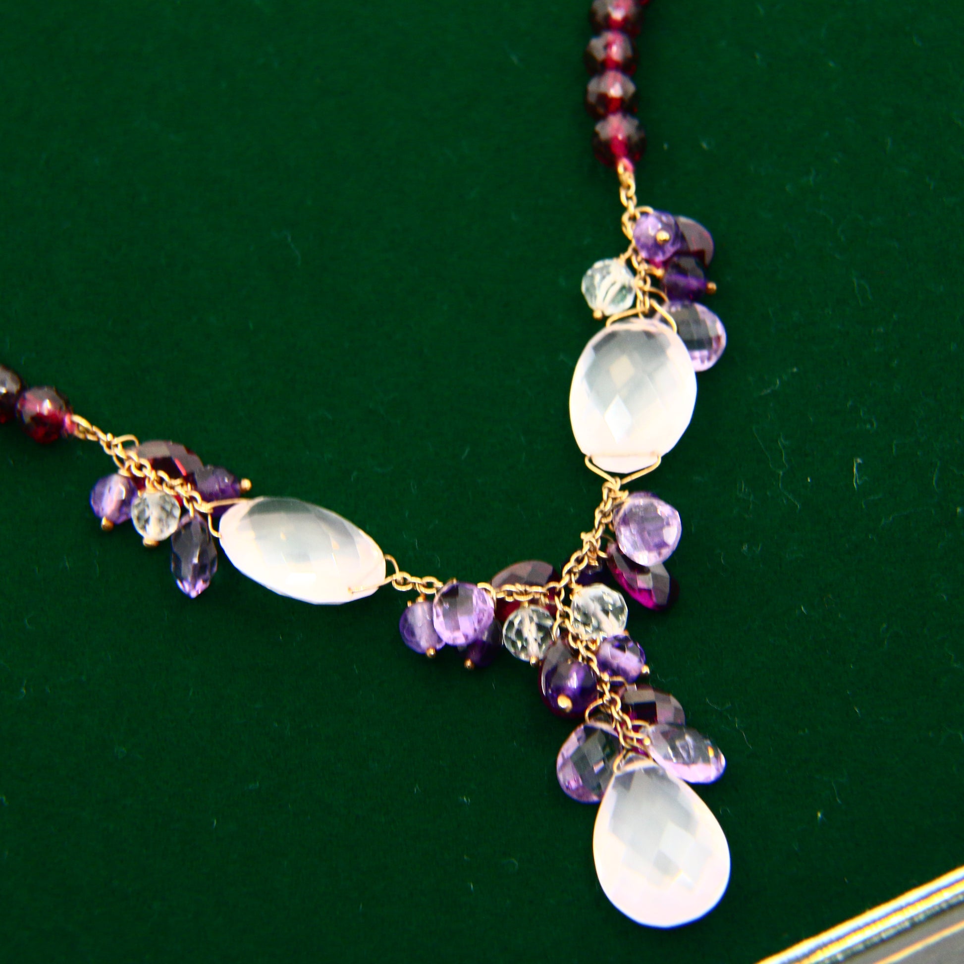Vintage 9ct Amethyst Rose Quart Garnet Drop Bead Necklace Yellow Gold Boxed