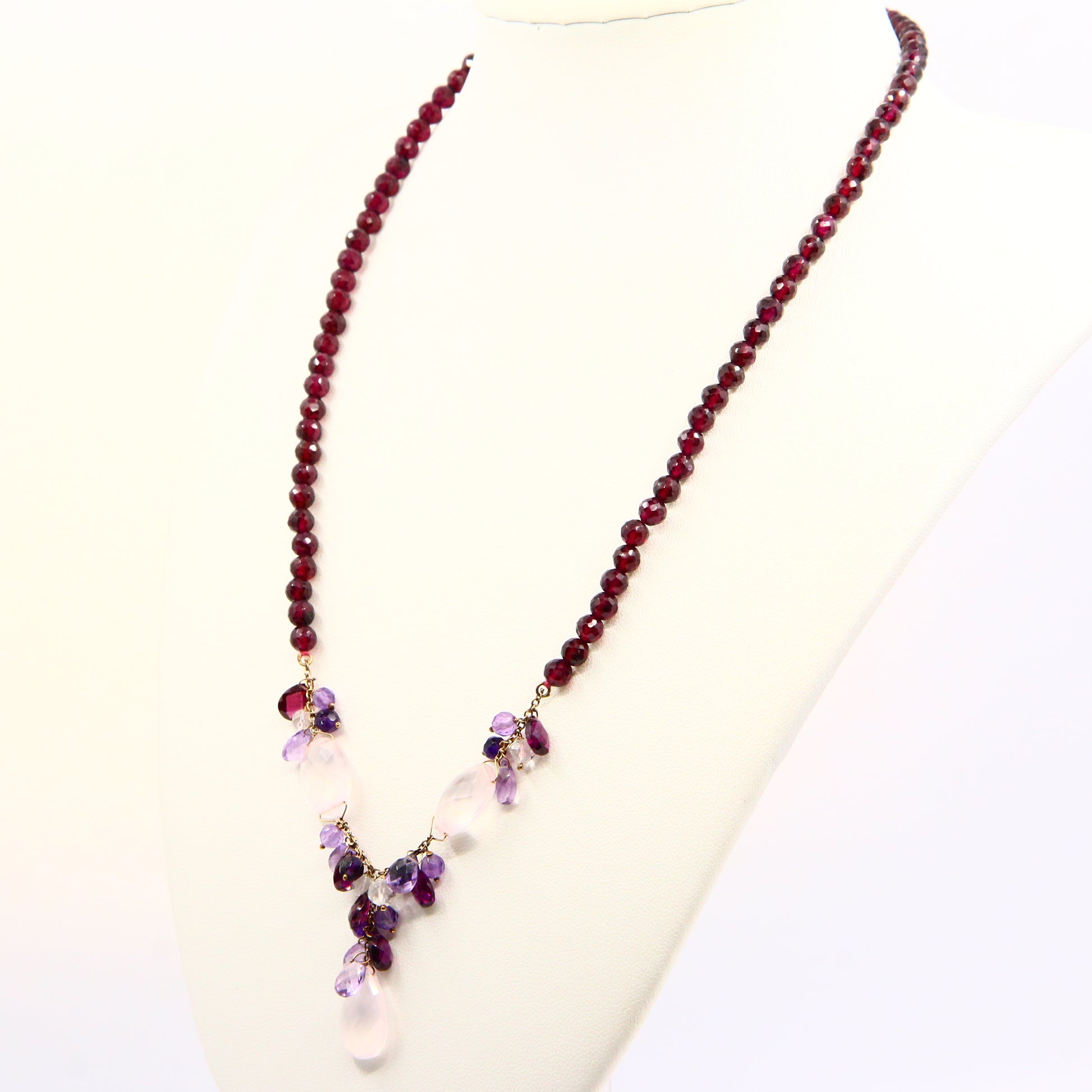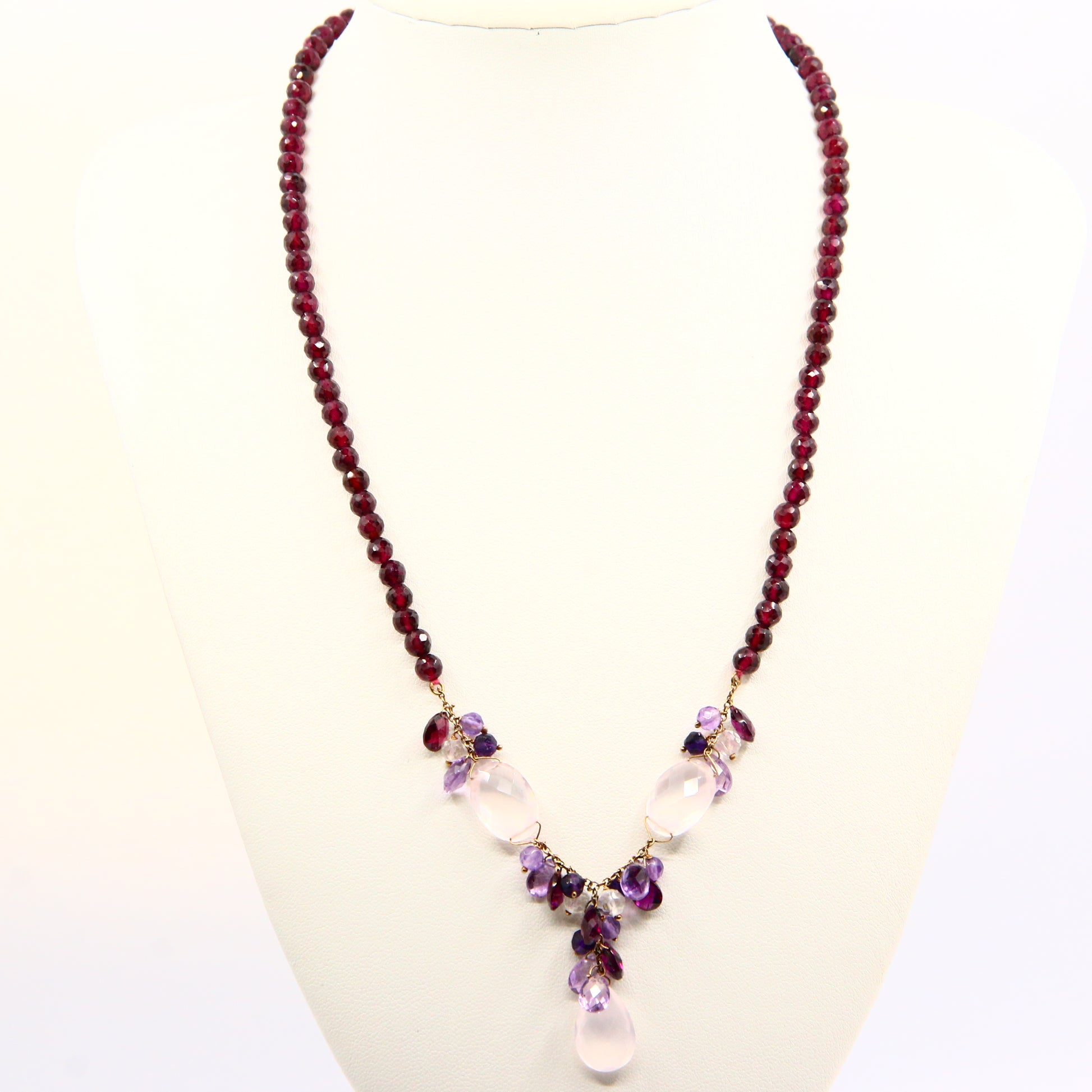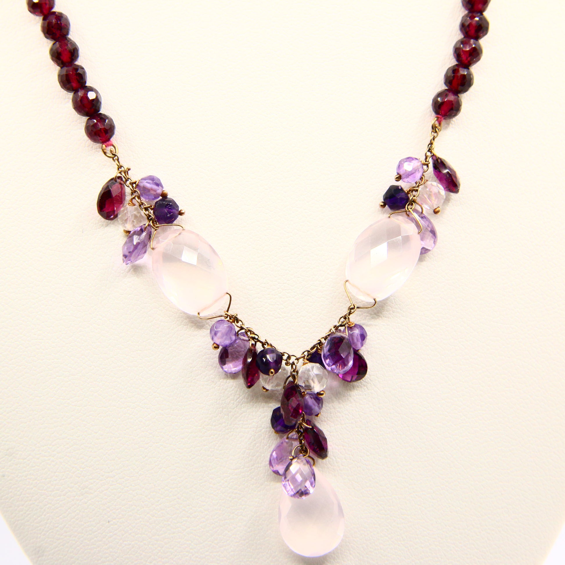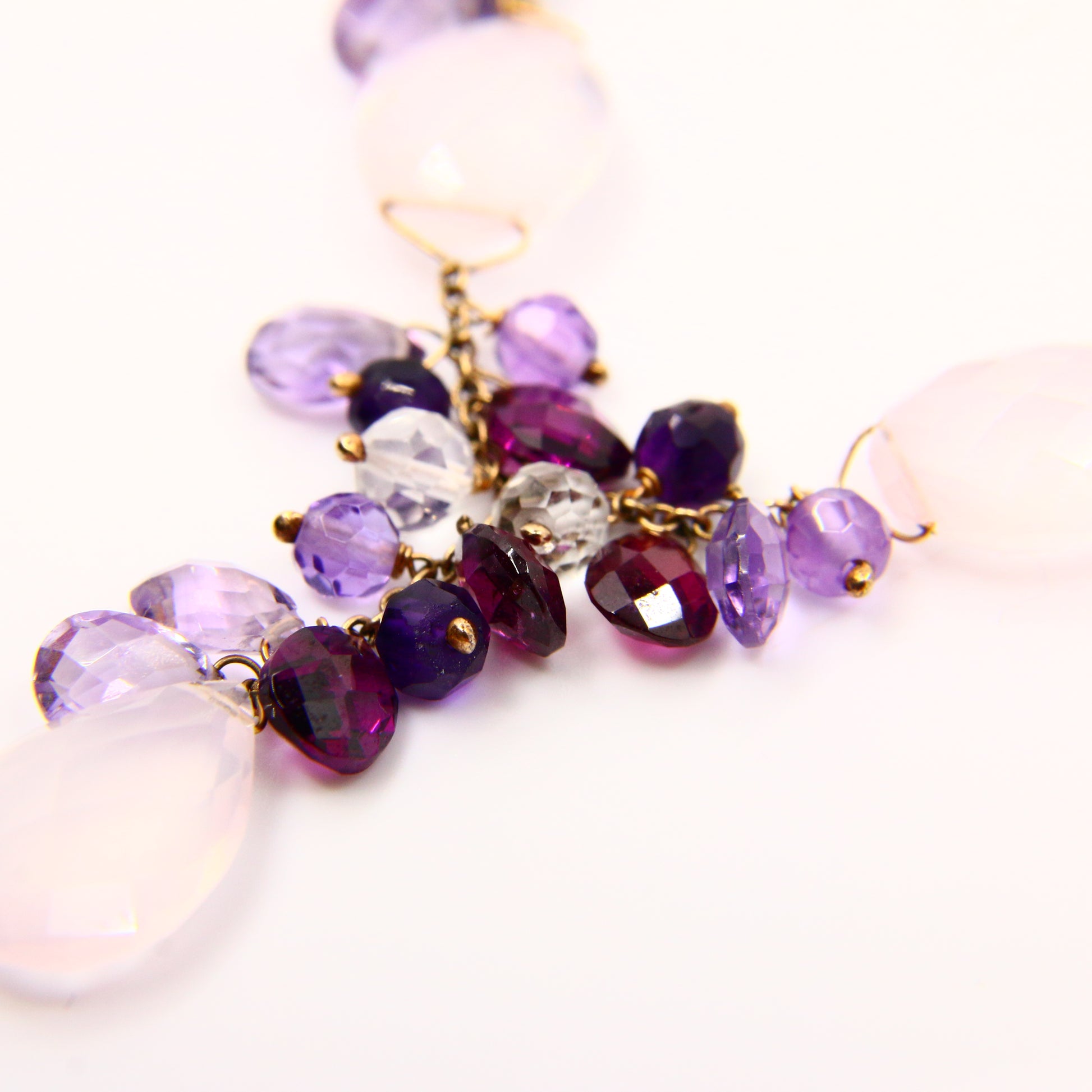 Vintage 9ct Amethyst Rose Quart Garnet Drop Bead Necklace Yellow Gold Boxed