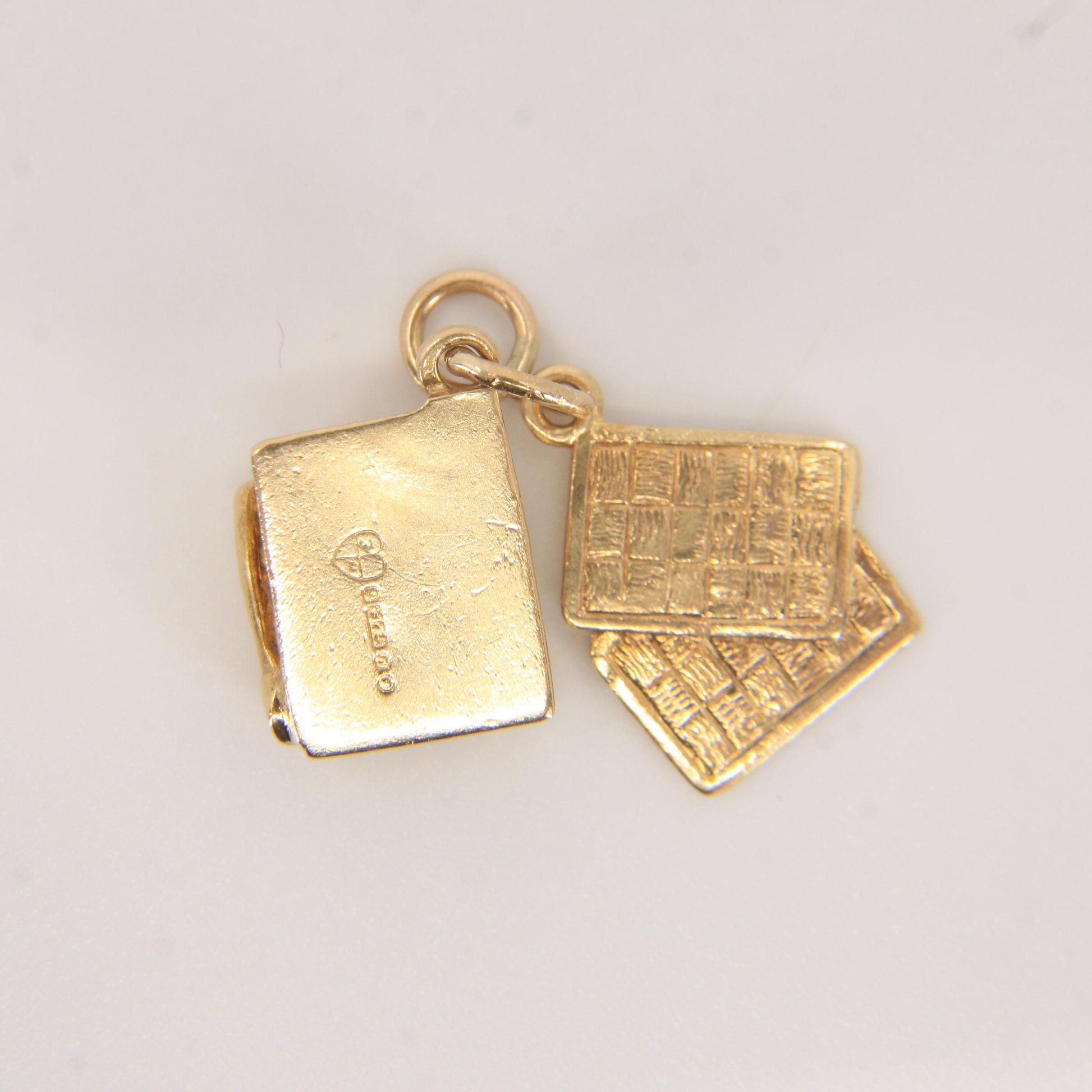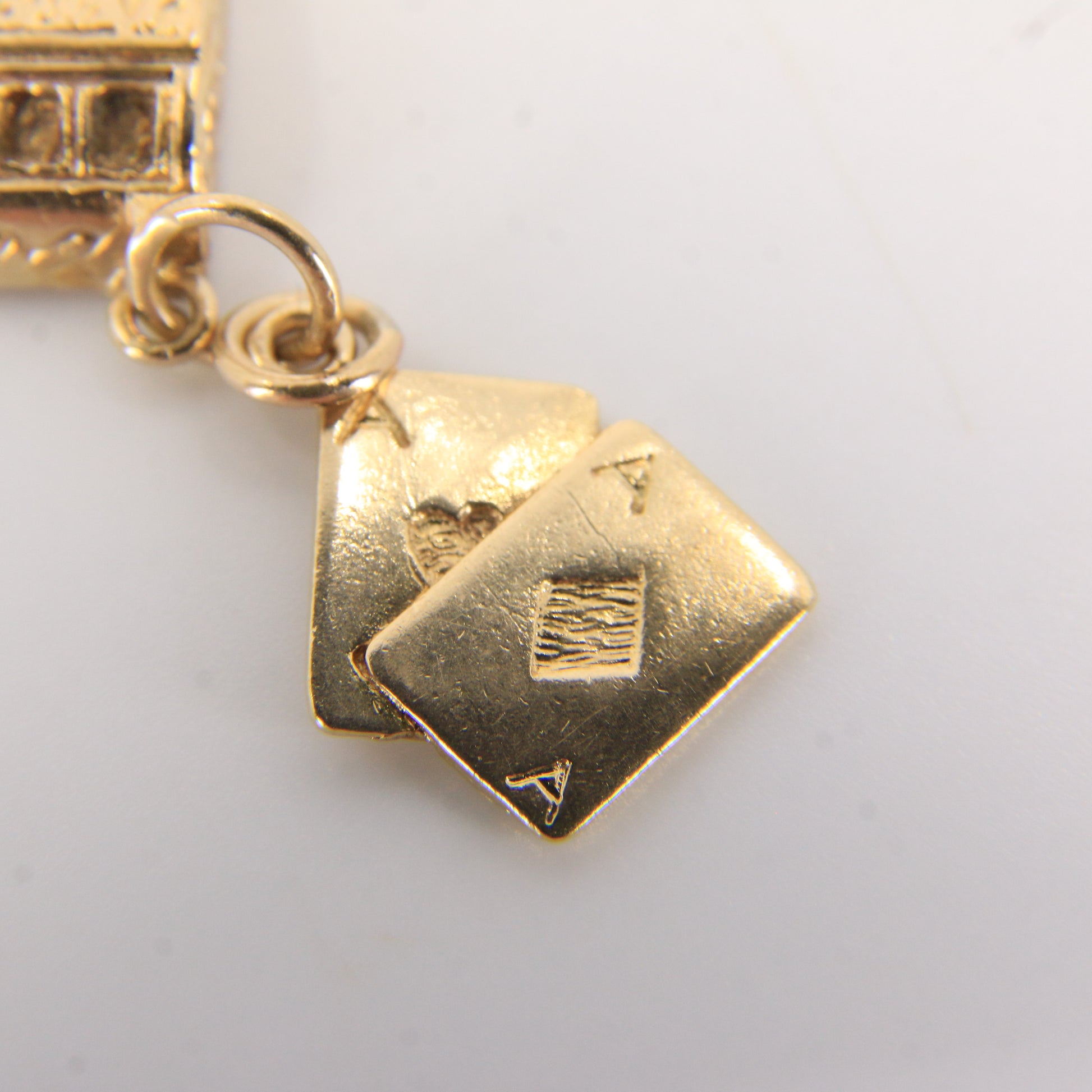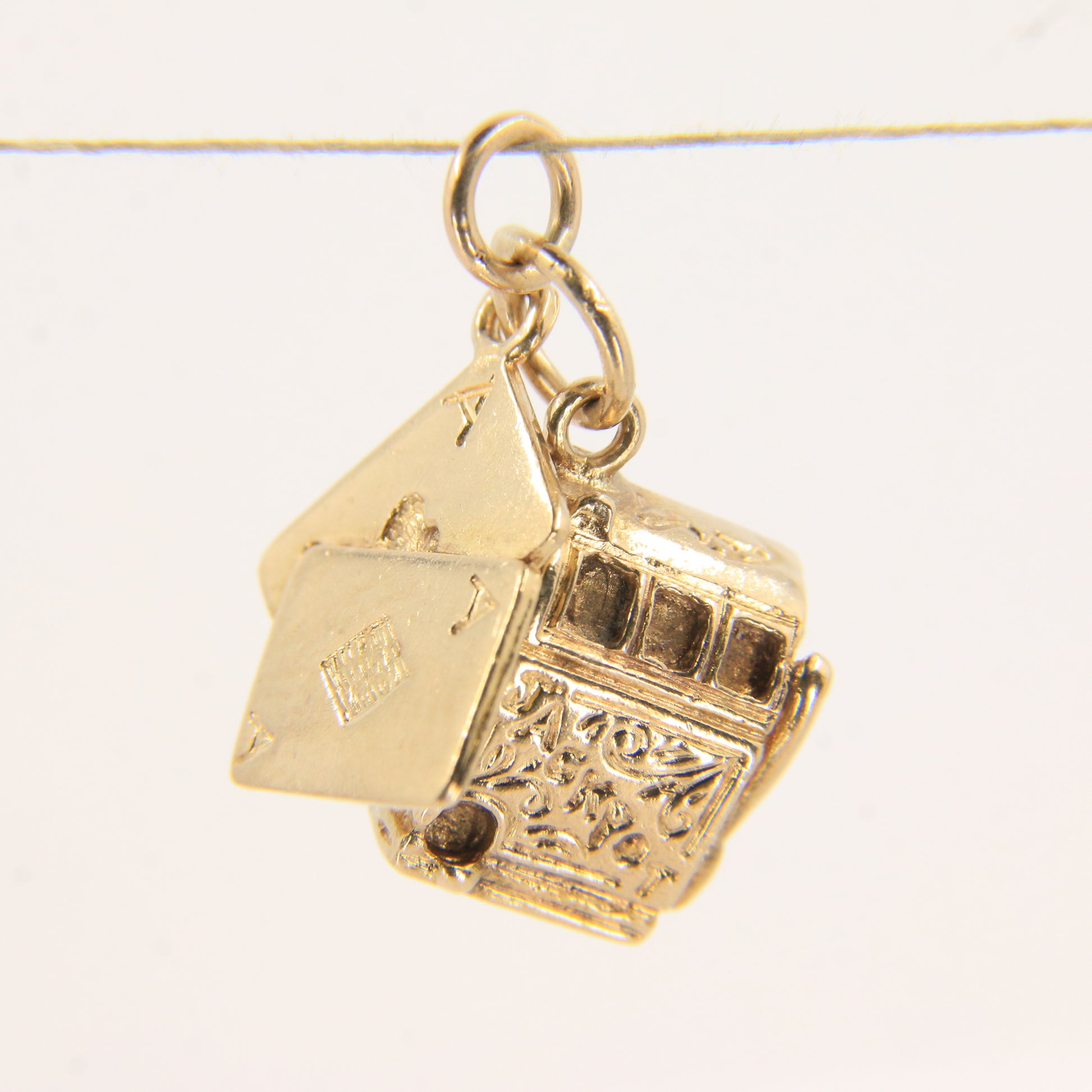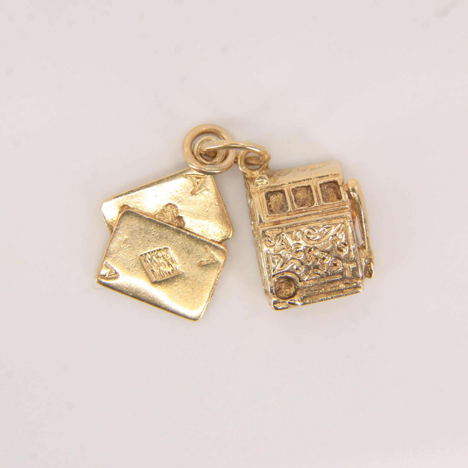 A vintage 9ct hallmarked gold casino charm set featuring a miniature slot machine “One Arm Bandit” and double ace “Pocket Rockets” hand. A fun and collectable solid gold pendant, this lucky charm makes a standout gift for any jewellery or casino enthusiast.