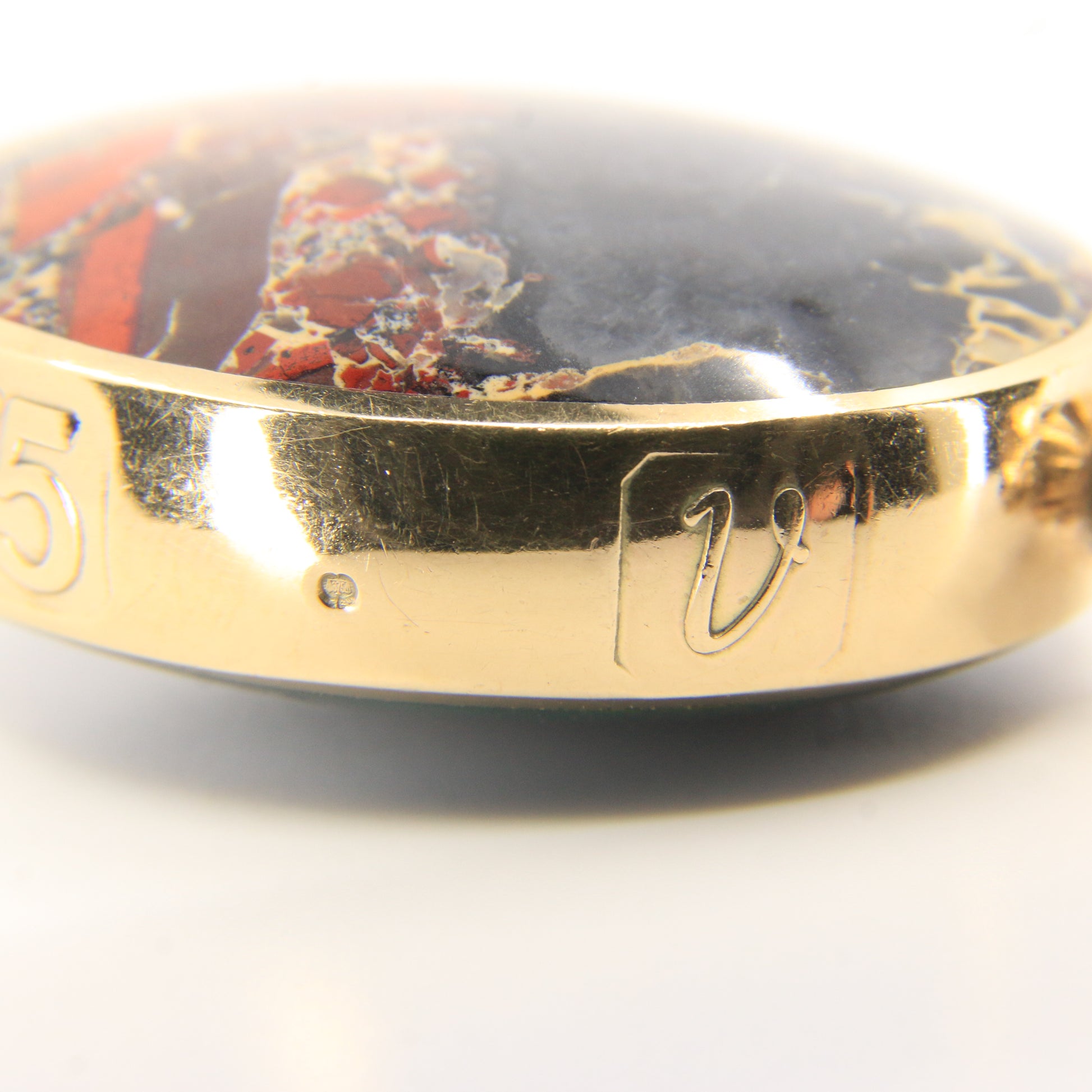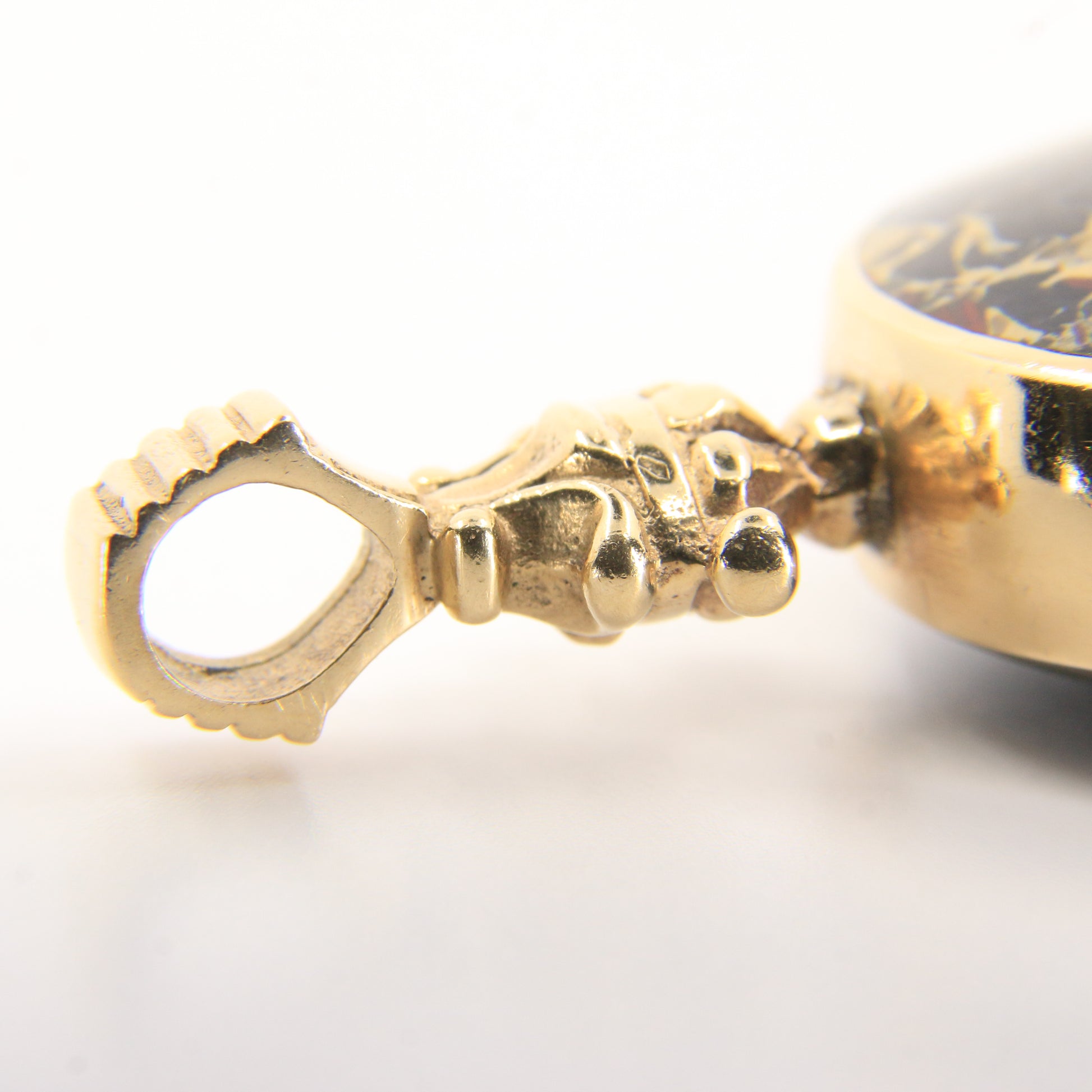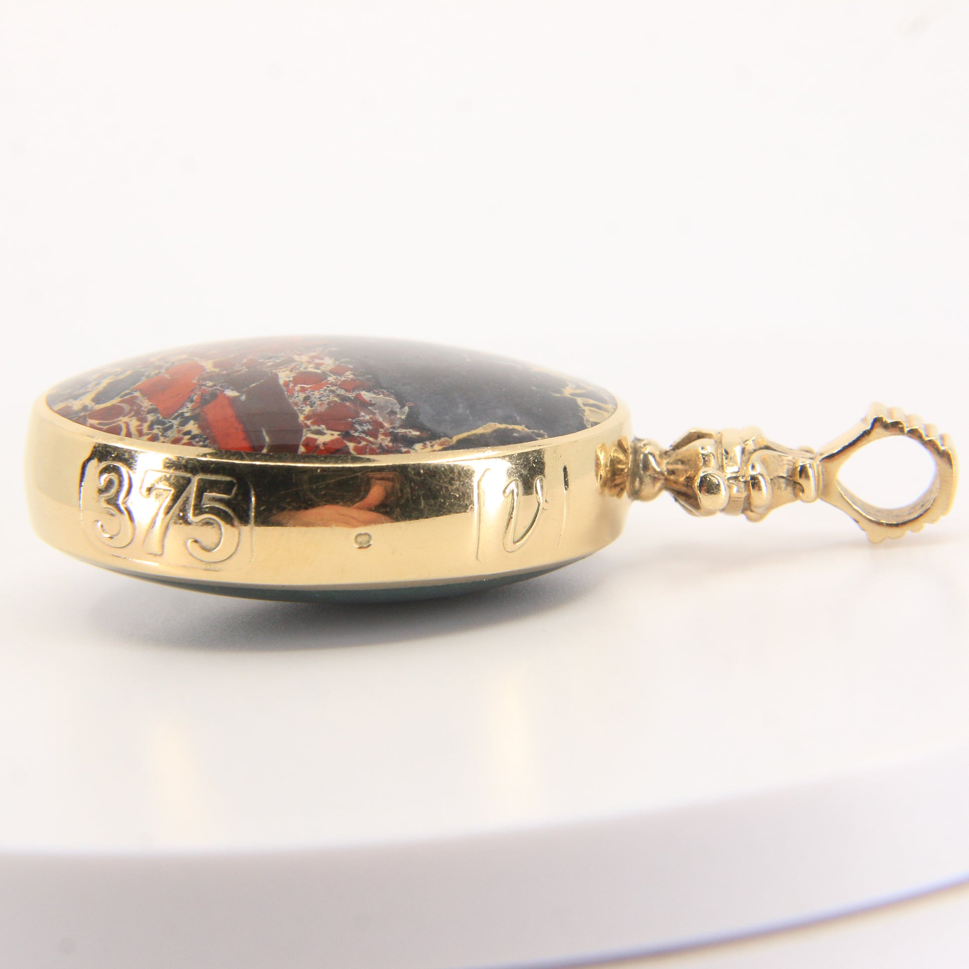 A striking vintage 9ct gold pendant set with malachite to one side and Blue John agate to the reverse, hallmarked and well finished. A distinctive double-sided gemstone charm with strong visual character—add this to your collection today.