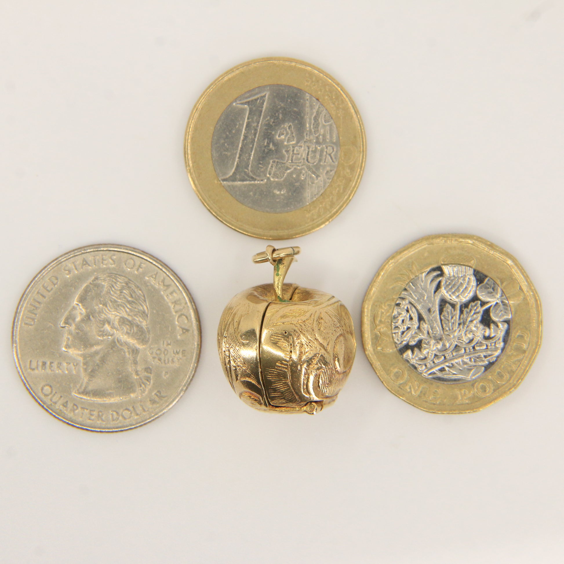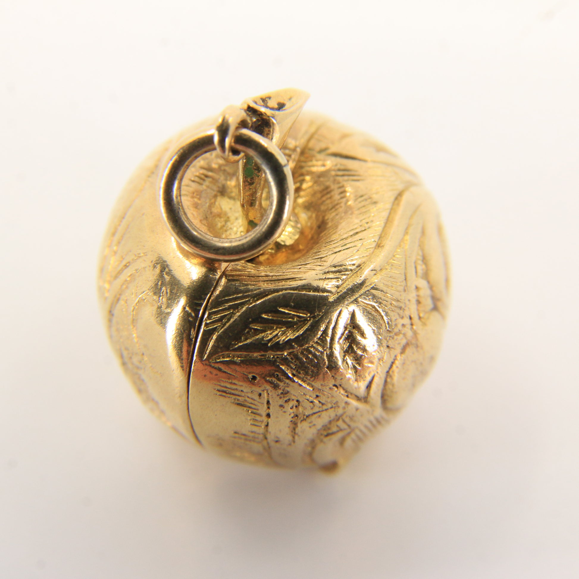 Vintage 9ct yellow gold opening apple charm with intricate enamel detail revealing a miniature Adam and Eve figure inside. A unique religious themed piece and a standout addition to any collection.