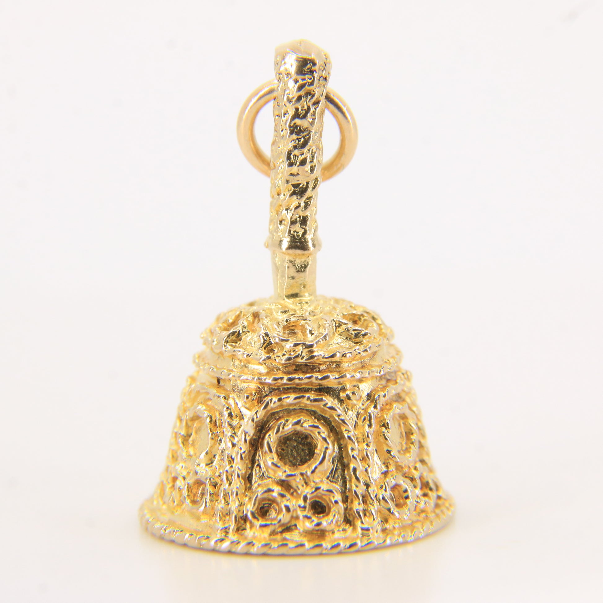 A vintage 9ct yellow gold hallmarked bell pendant charm with ornate detailing and a working ringer. A delightful and unique jewellery piece — add this hallmarked gold bell to your collection today.
