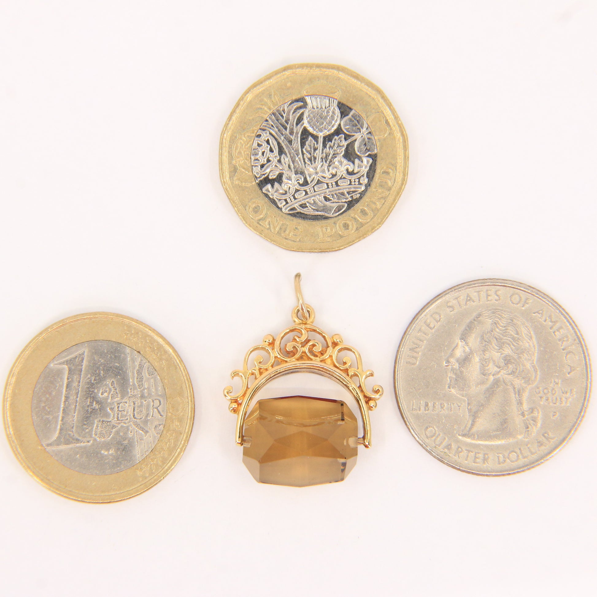 A vintage 9ct yellow gold hallmarked spinner pendant set with a faceted citrine stone, mounted in an ornate swivel frame. This elegant solid gold charm is perfect for wearing on a chain or adding to a bracelet. Make it yours today and enjoy a timeless antique treasure.