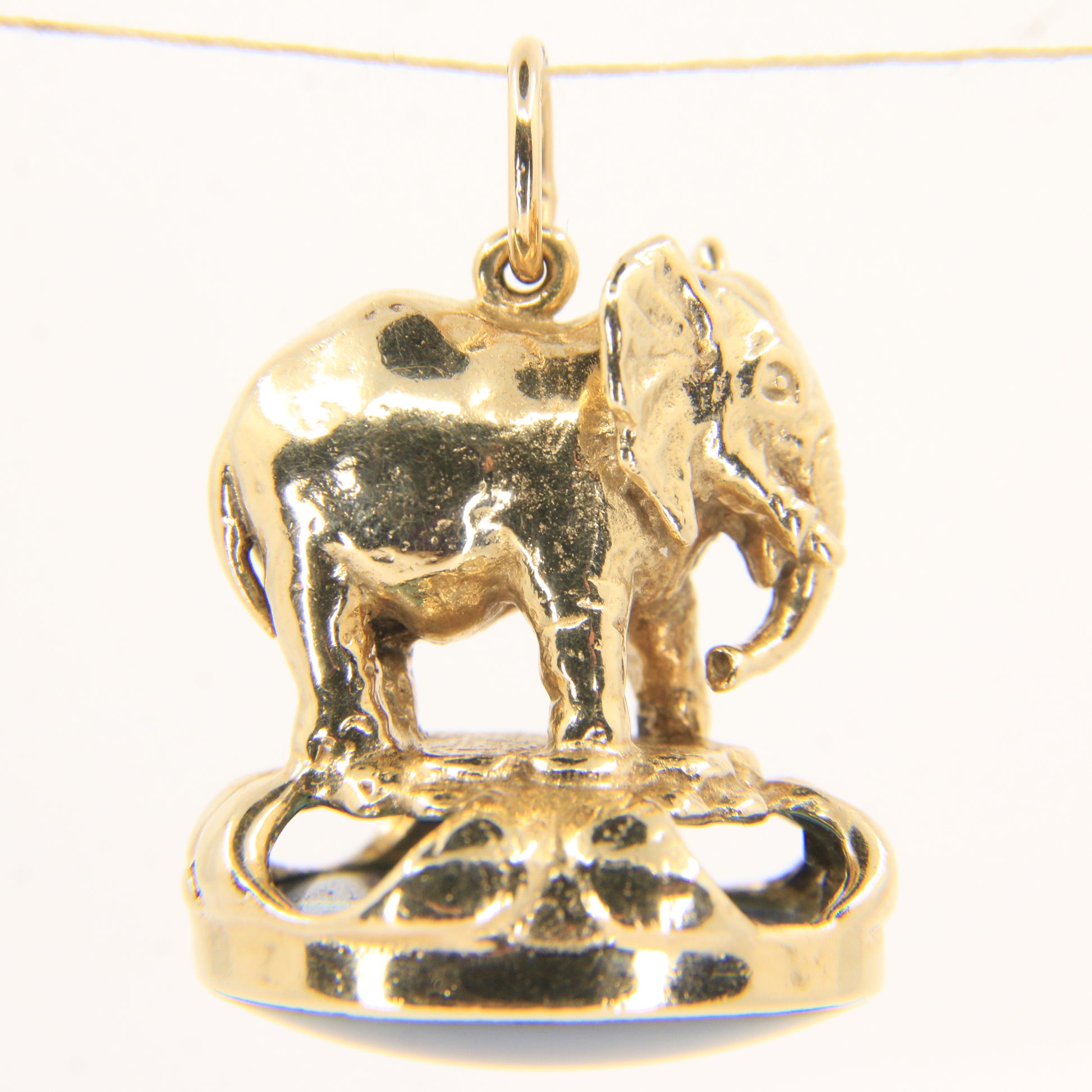 A vintage 9ct yellow gold hallmarked elephant pendant charm, mounted on a polished blue agate base. A unique and characterful jewellery piece — add this hallmarked gold and agate pendant to your collection today.