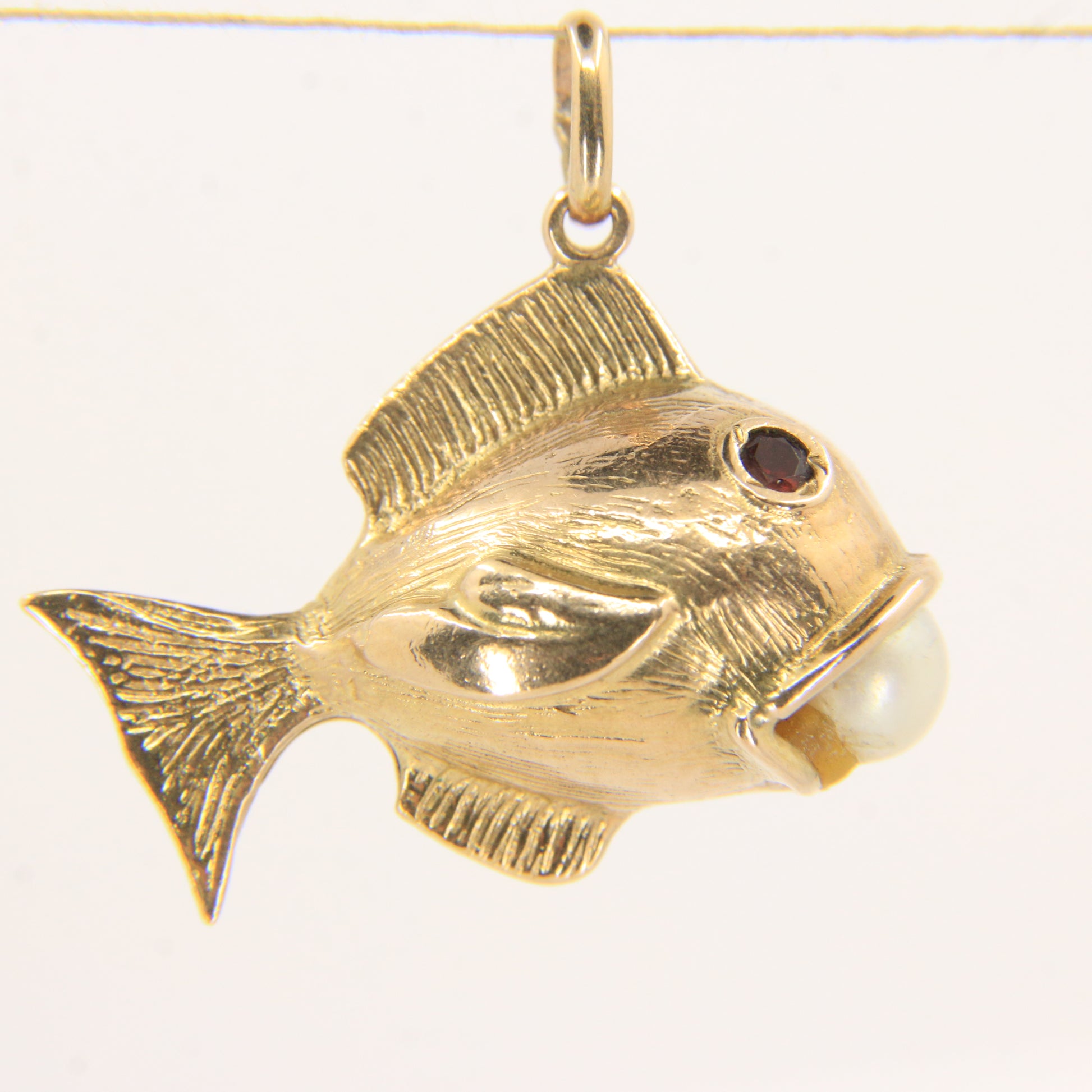 A vintage 9ct yellow gold hallmarked fish pendant charm, set with a pearl in its mouth and red stone eyes. A fun and unique hallmarked piece of jewellery — add this eye-catching charm to your collection today.