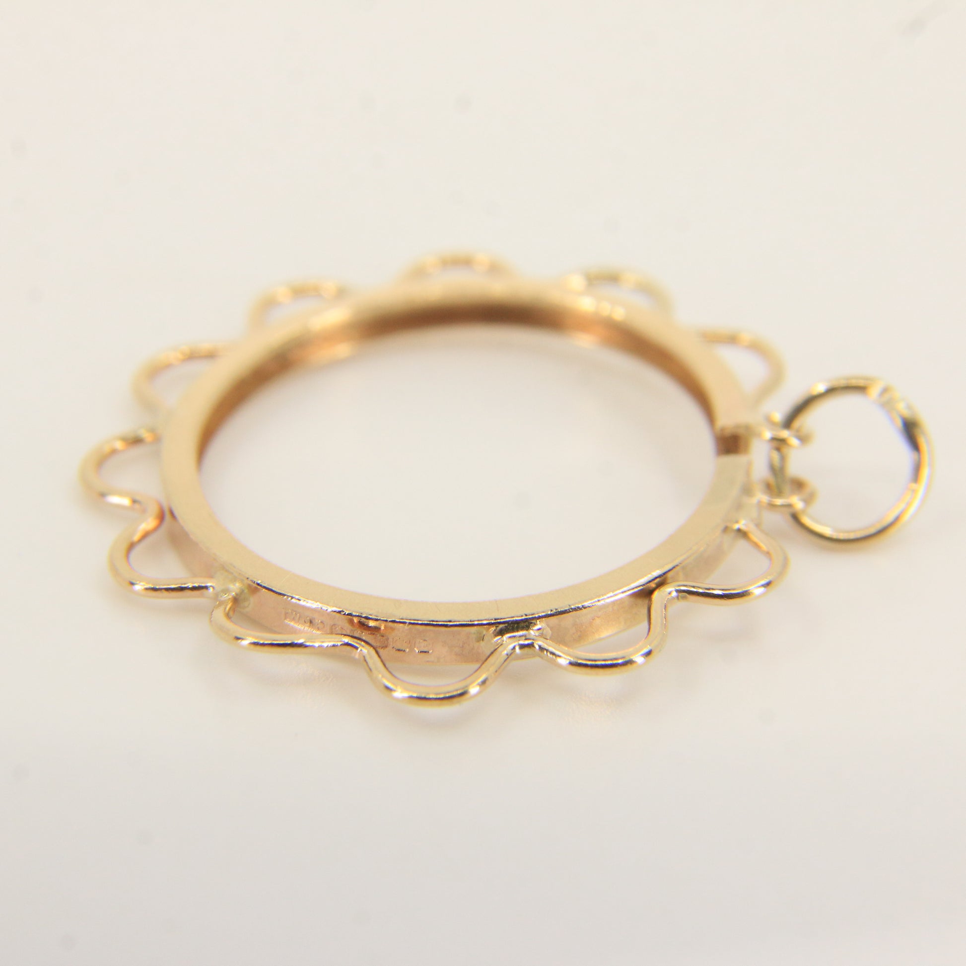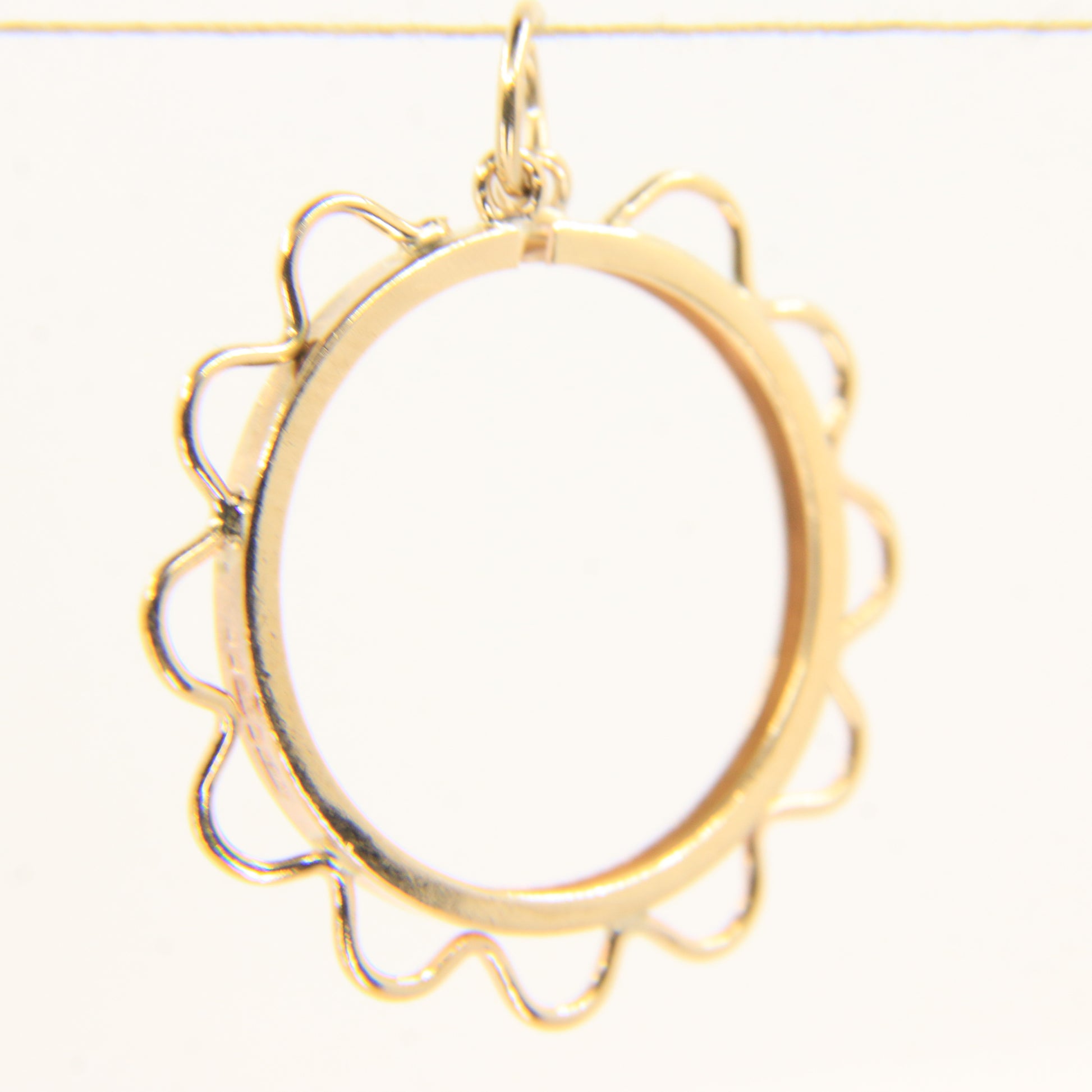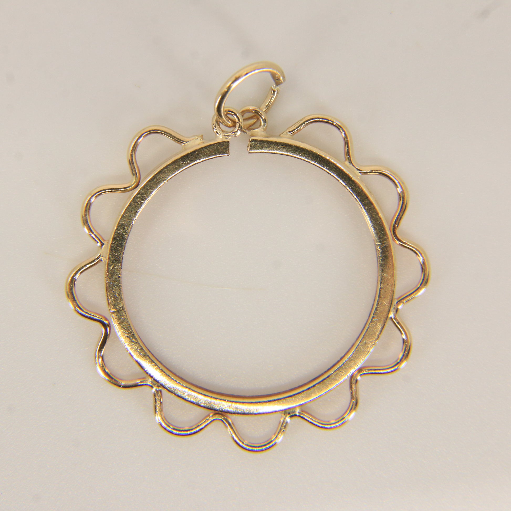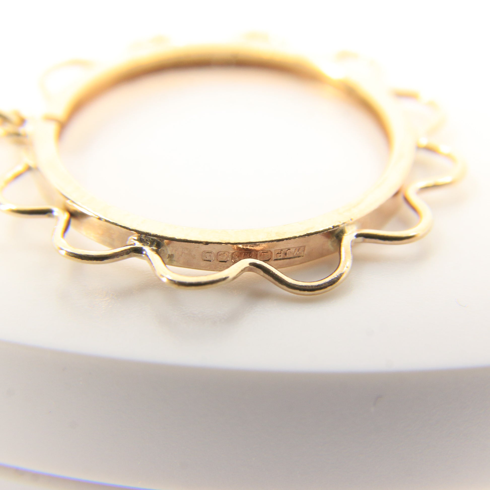 A vintage 9ct hallmarked gold half sovereign coin holder pendant designed to securely display and wear a coin as jewellery. A classic and collectable mount charm — add this versatile piece to your collection today.