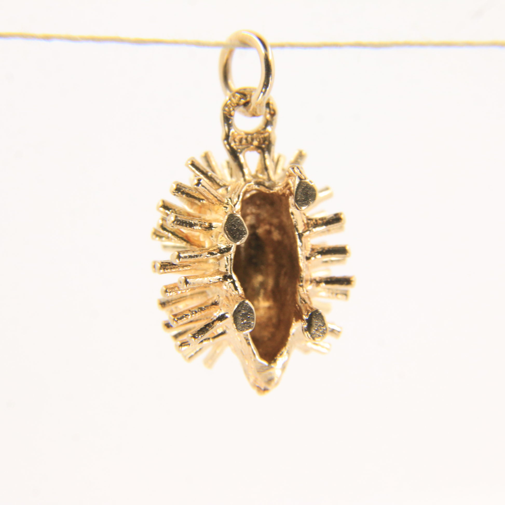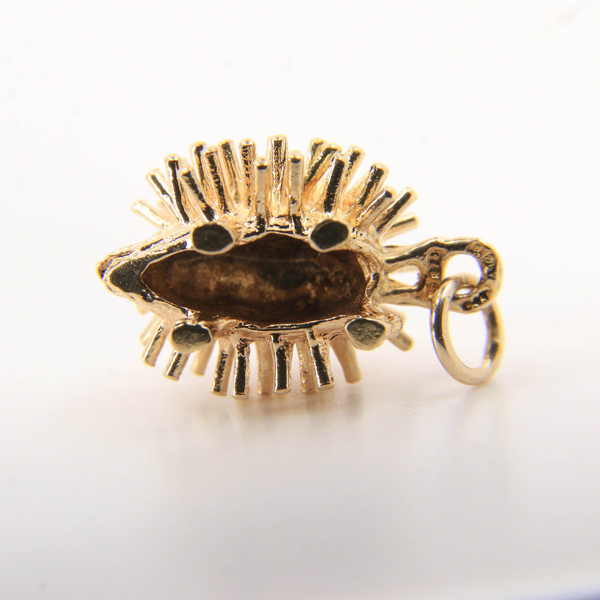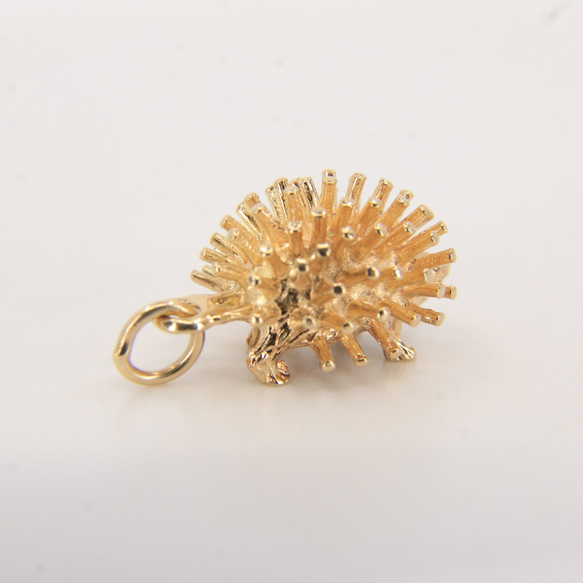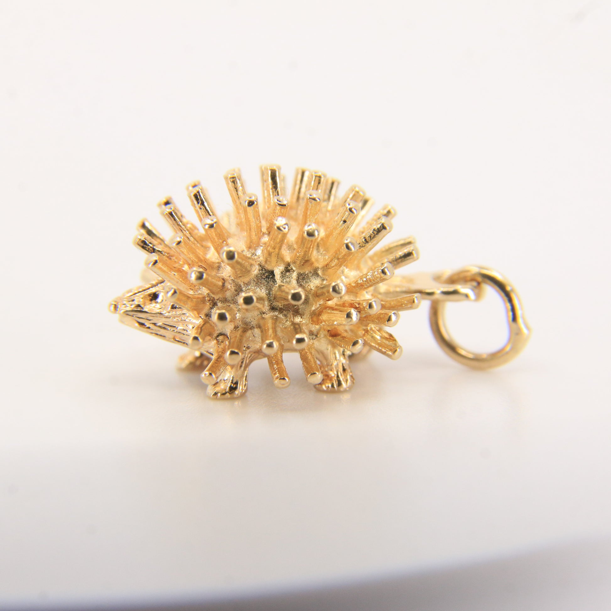 A vintage 9ct hallmarked gold hedgehog charm with detailed textured spines, crafted in solid yellow gold. A whimsical and collectable animal pendant — add this unique piece of jewellery to your charm collection today.