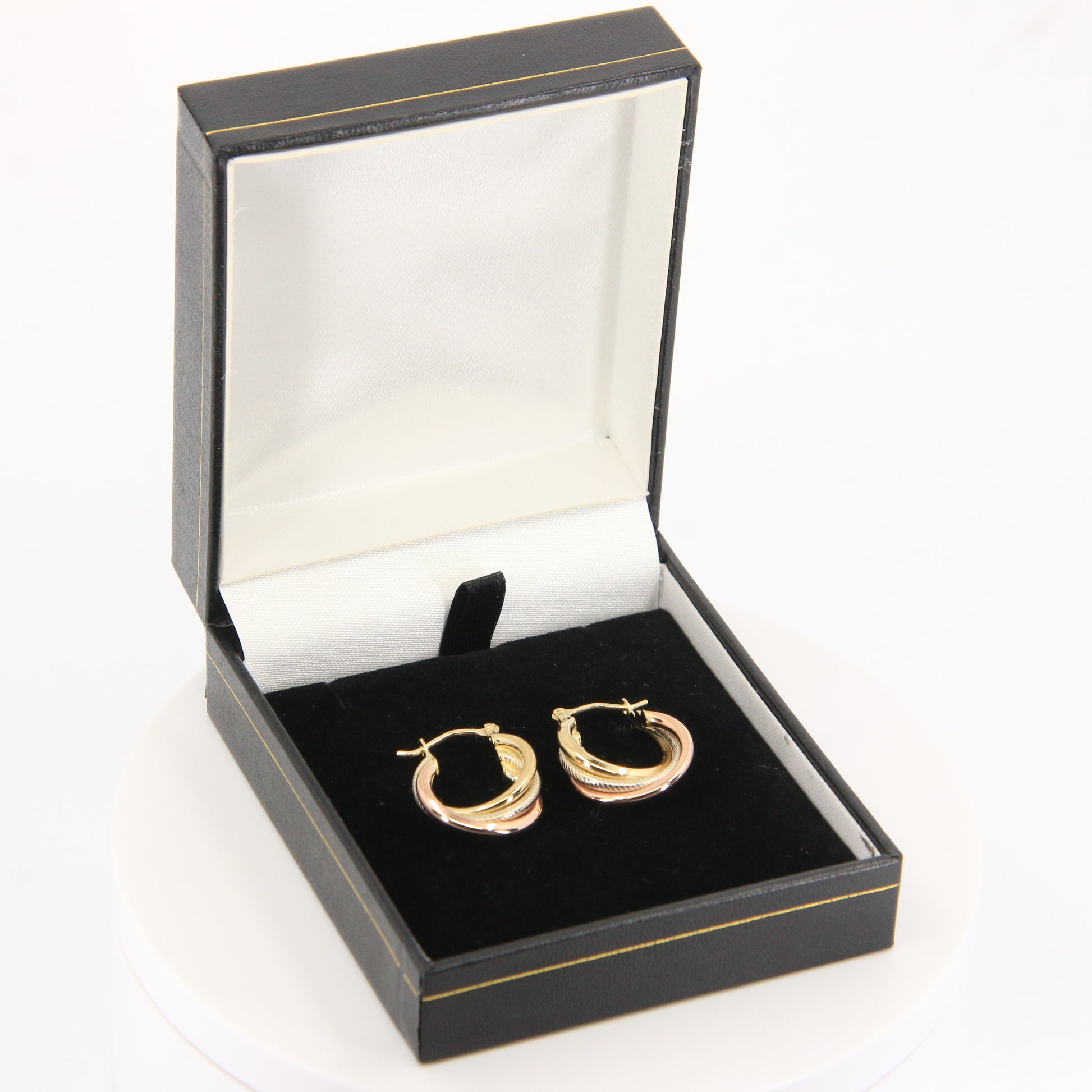 Stylish vintage 9ct gold Russian style hoop earrings crafted in three tones of yellow, white and rose gold. Fully hallmarked and boxed, they make a versatile and elegant jewellery gift.