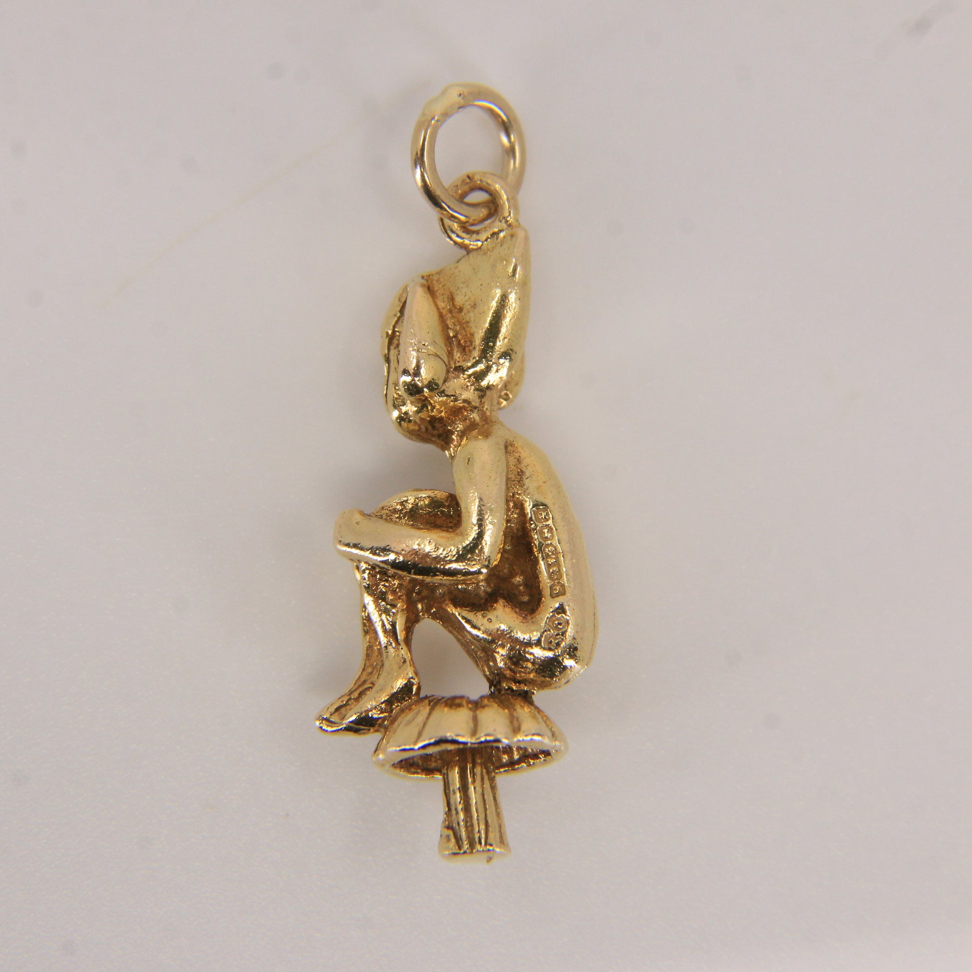 A delightful vintage 9ct yellow gold pendant charm featuring an elf sitting on a mushroom. Beautifully detailed and hallmarked, this fantasy-inspired piece makes a wonderful gold gift or collectable addition.