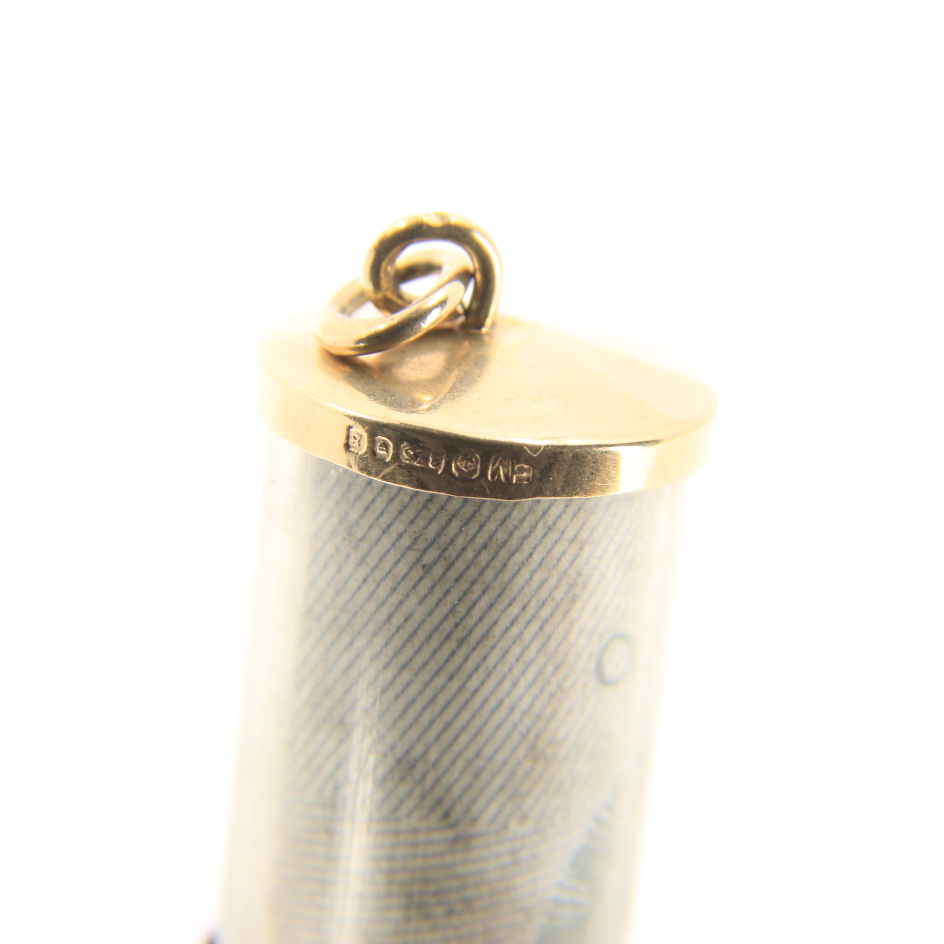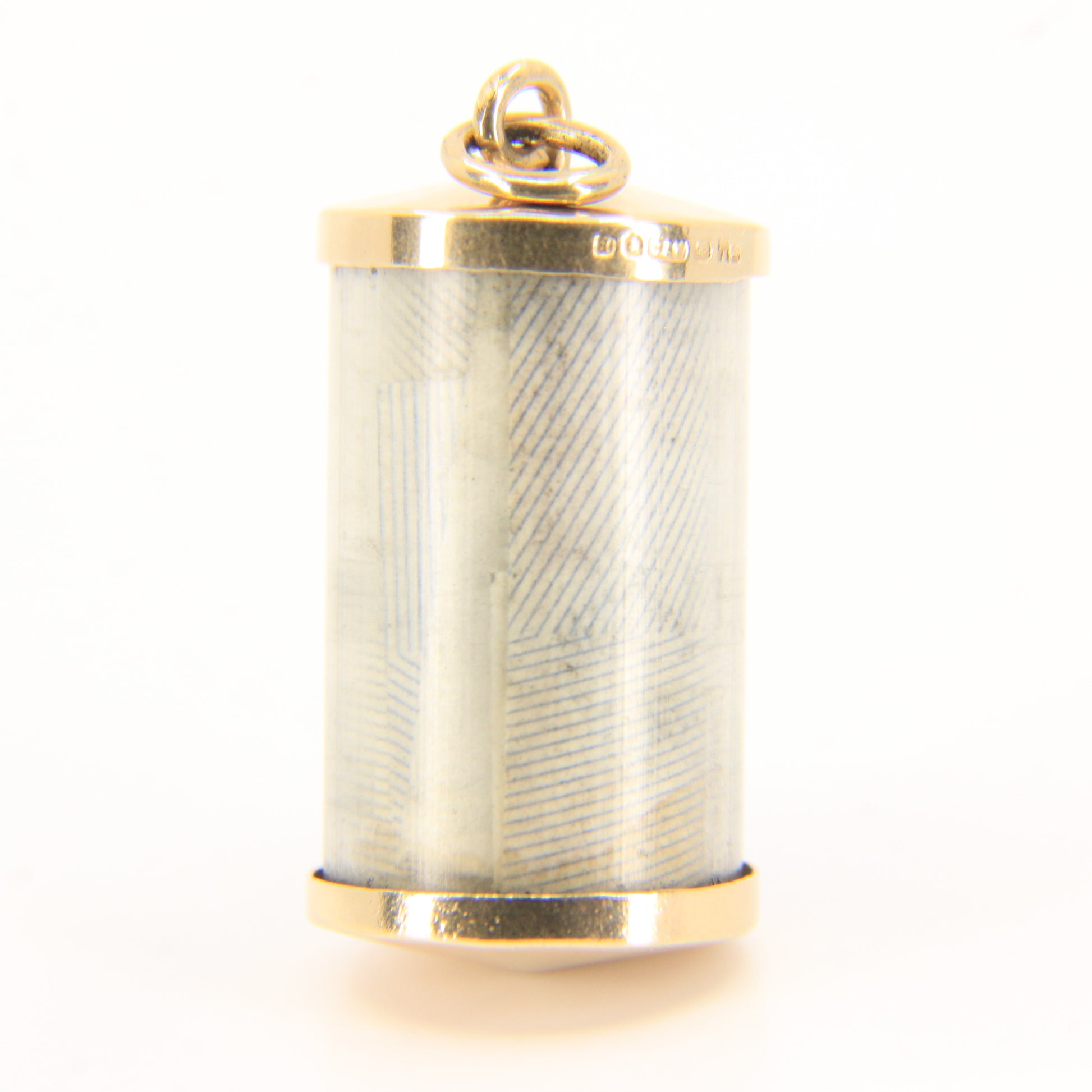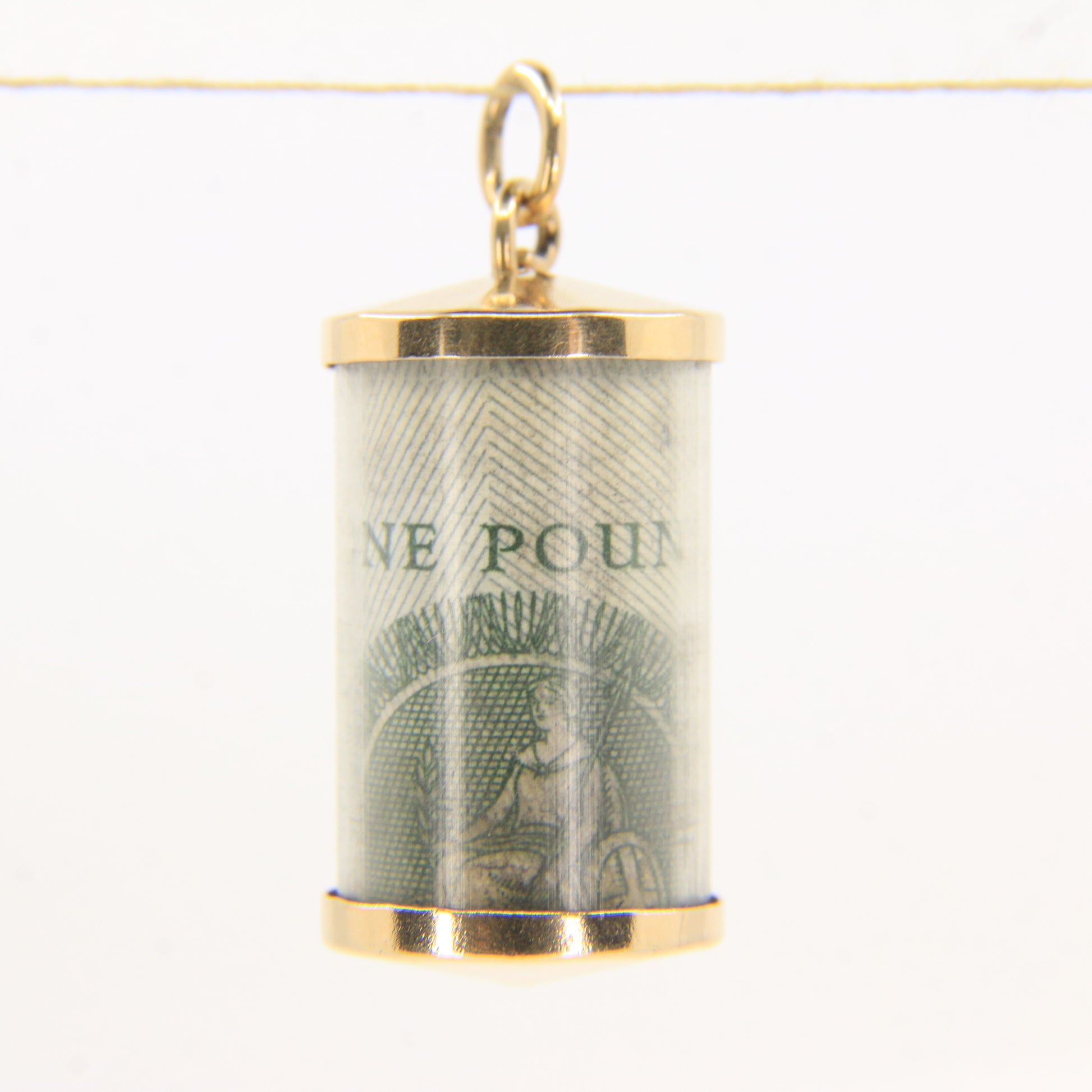 A charming vintage luck pendant featuring an original £1 UK currency note, securely cased in 9ct gold and fully hallmarked. A distinctive piece of British monetary history with strong symbolic appeal—add this to your collection today.