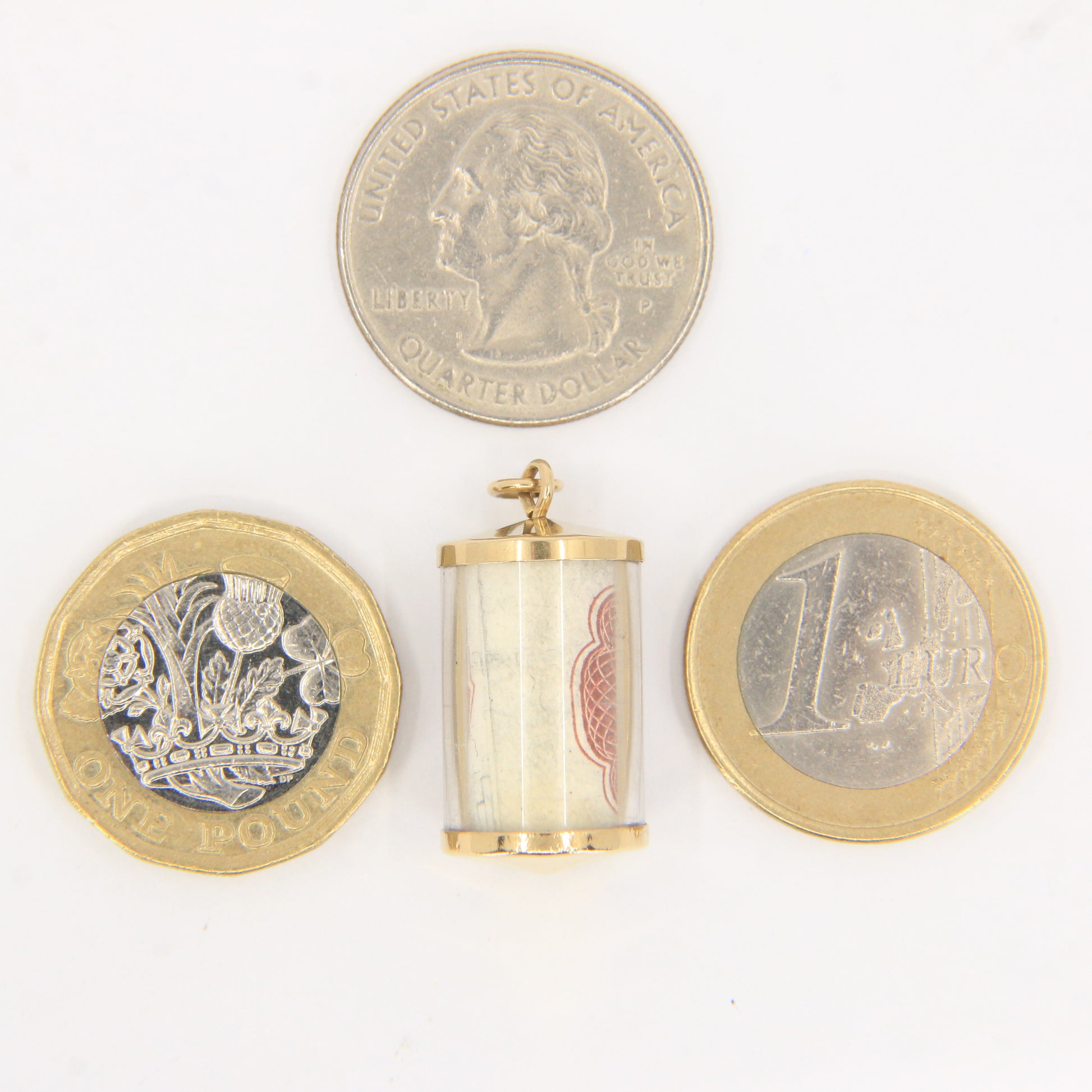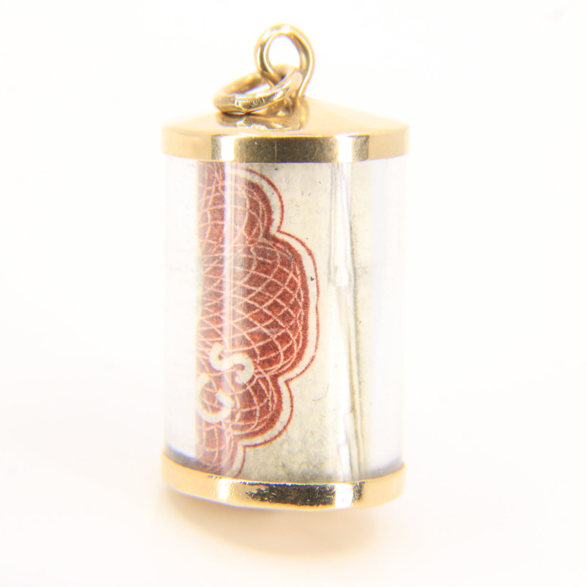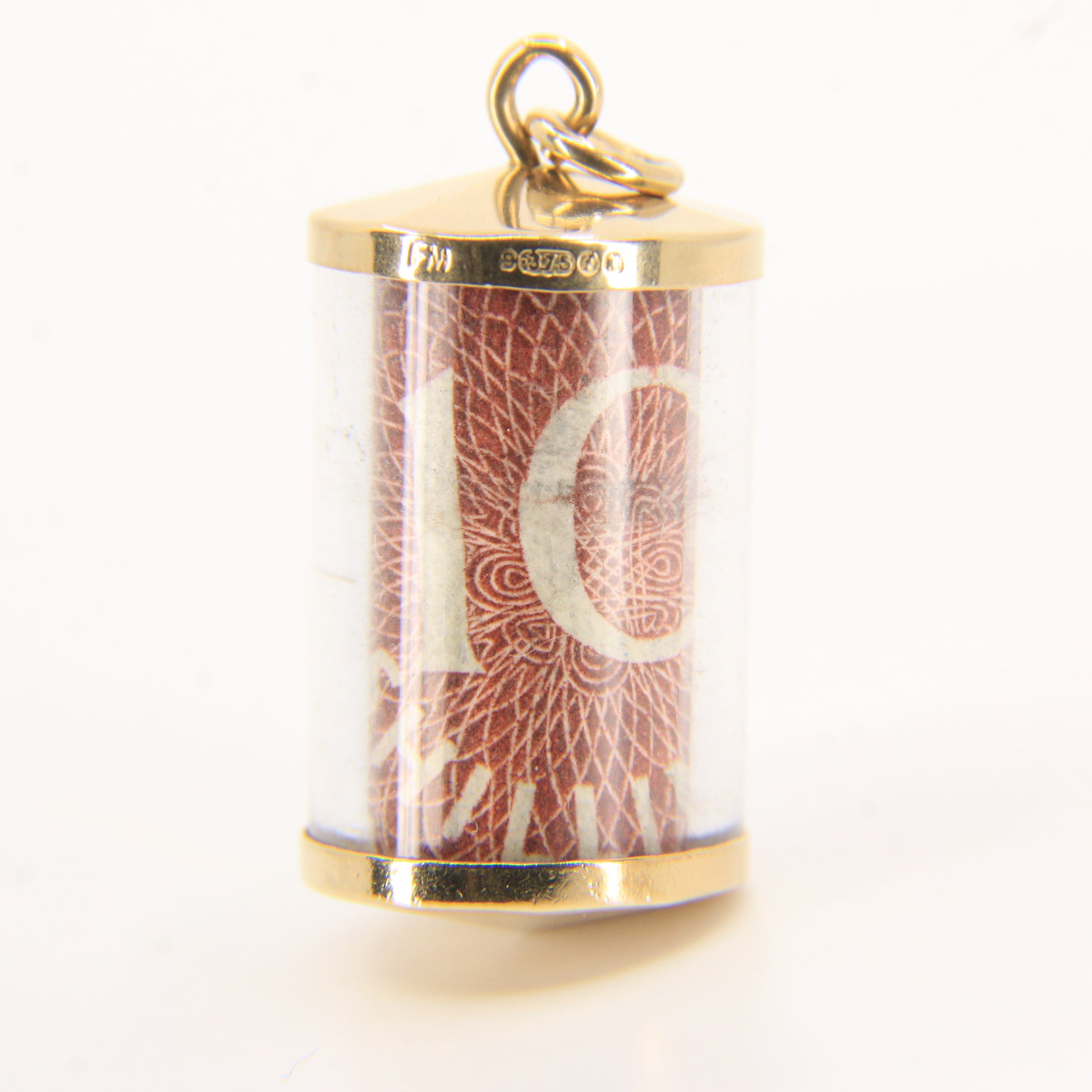 A distinctive vintage luck charm featuring an original 10 shilling UK currency note, securely cased in 9ct gold and fully hallmarked. A fascinating piece of British monetary history with strong symbolic appeal—add this to your collection today.