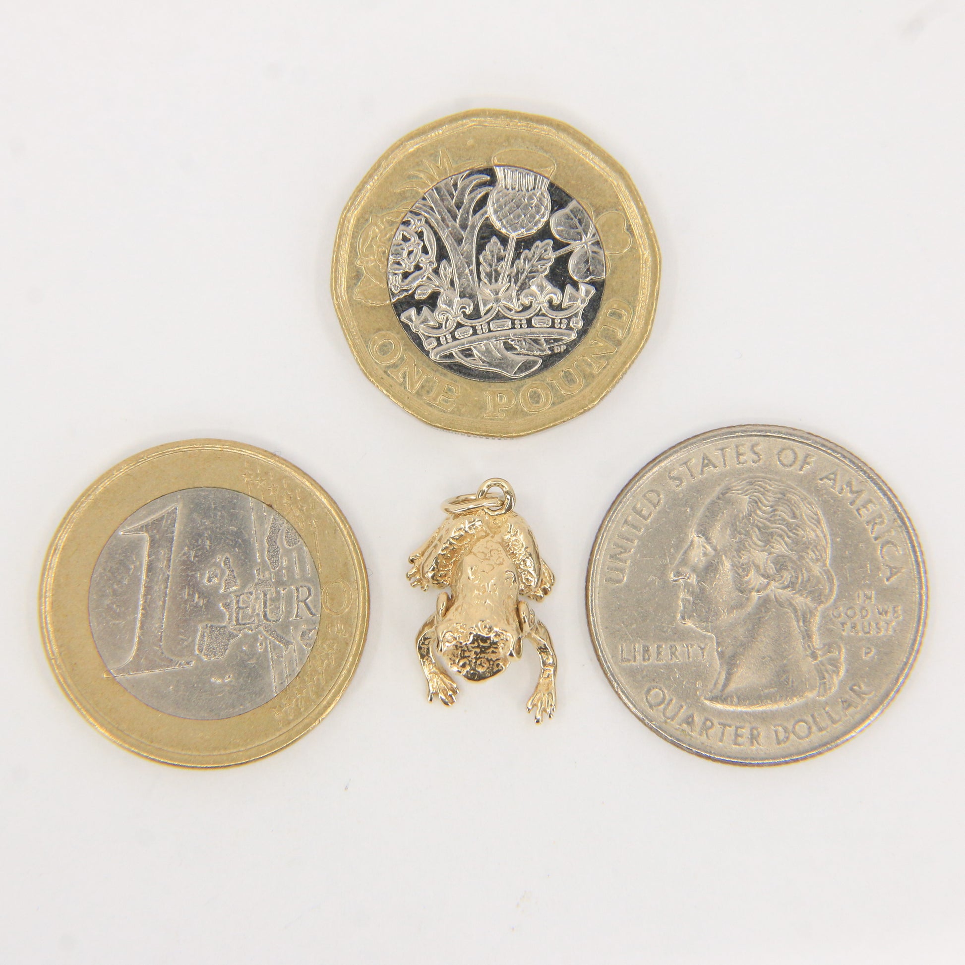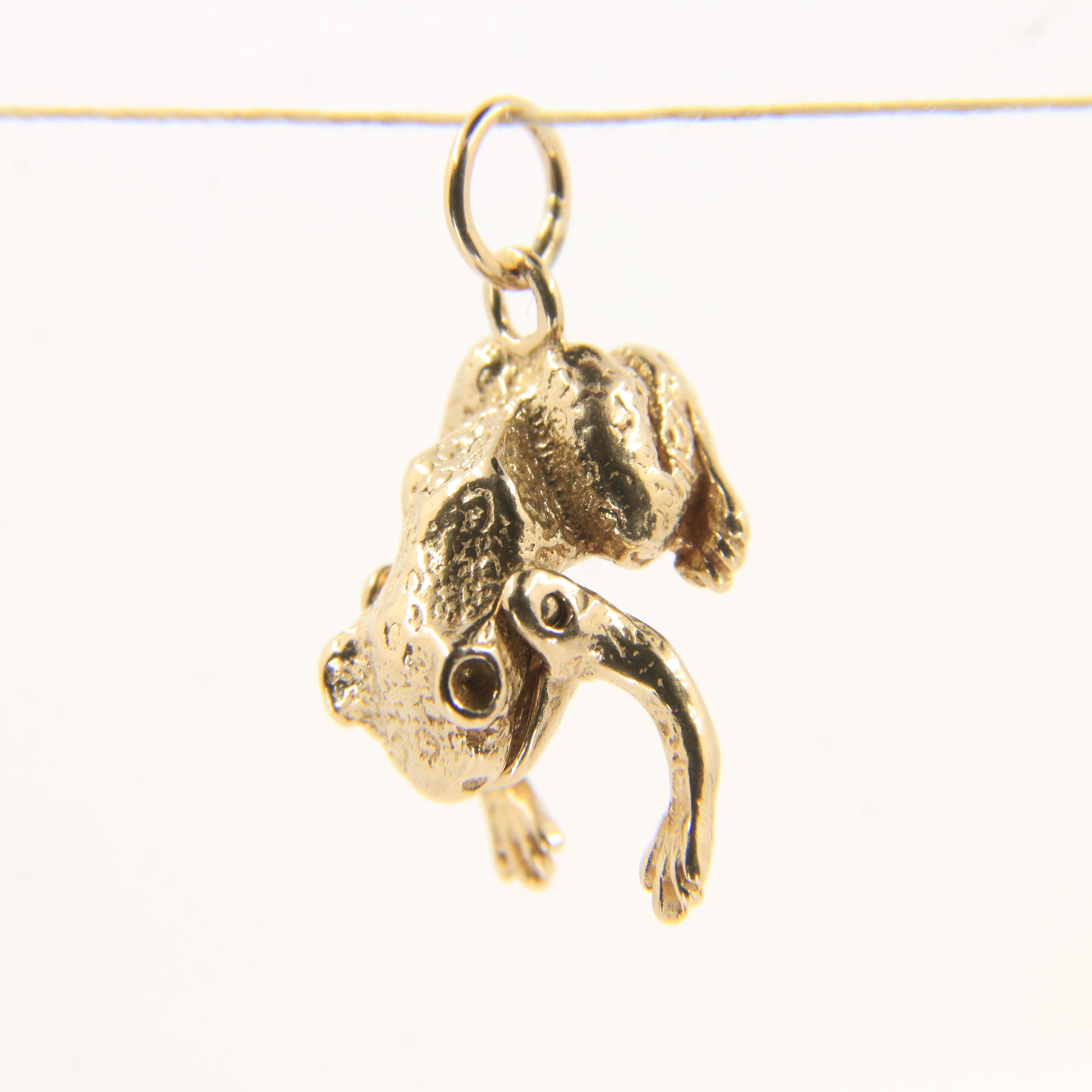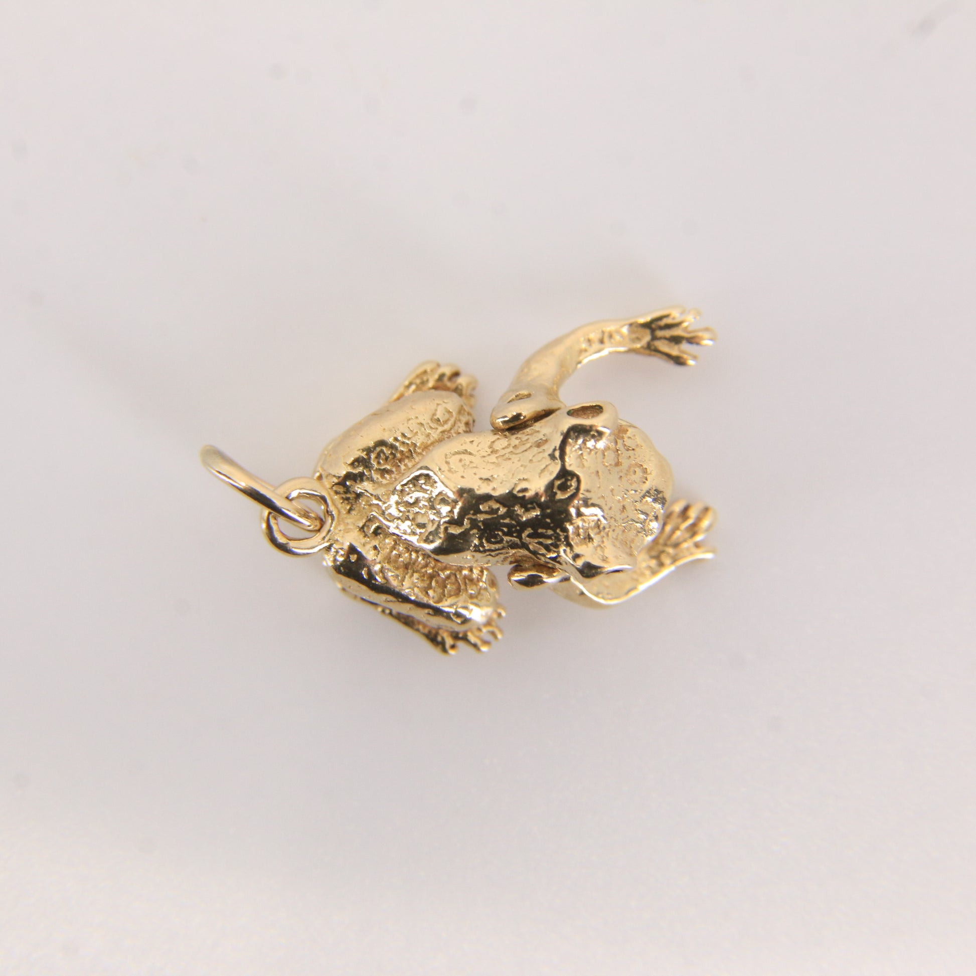A vintage 9ct hallmarked gold frog charm with articulated front legs that pull back to open its mouth. A fun and detailed mechanical piece perfect for bracelets or pendants. Add it to your collection today.