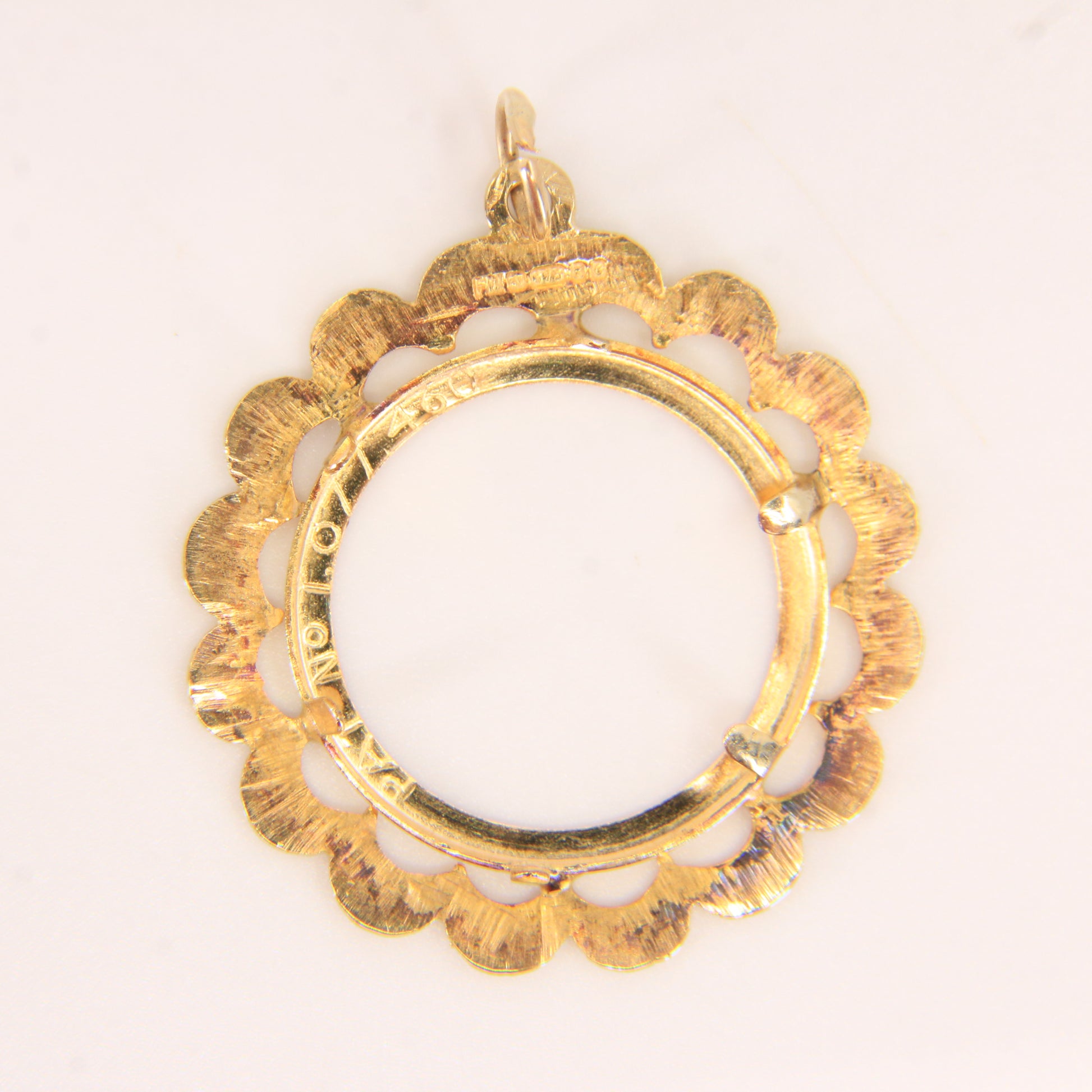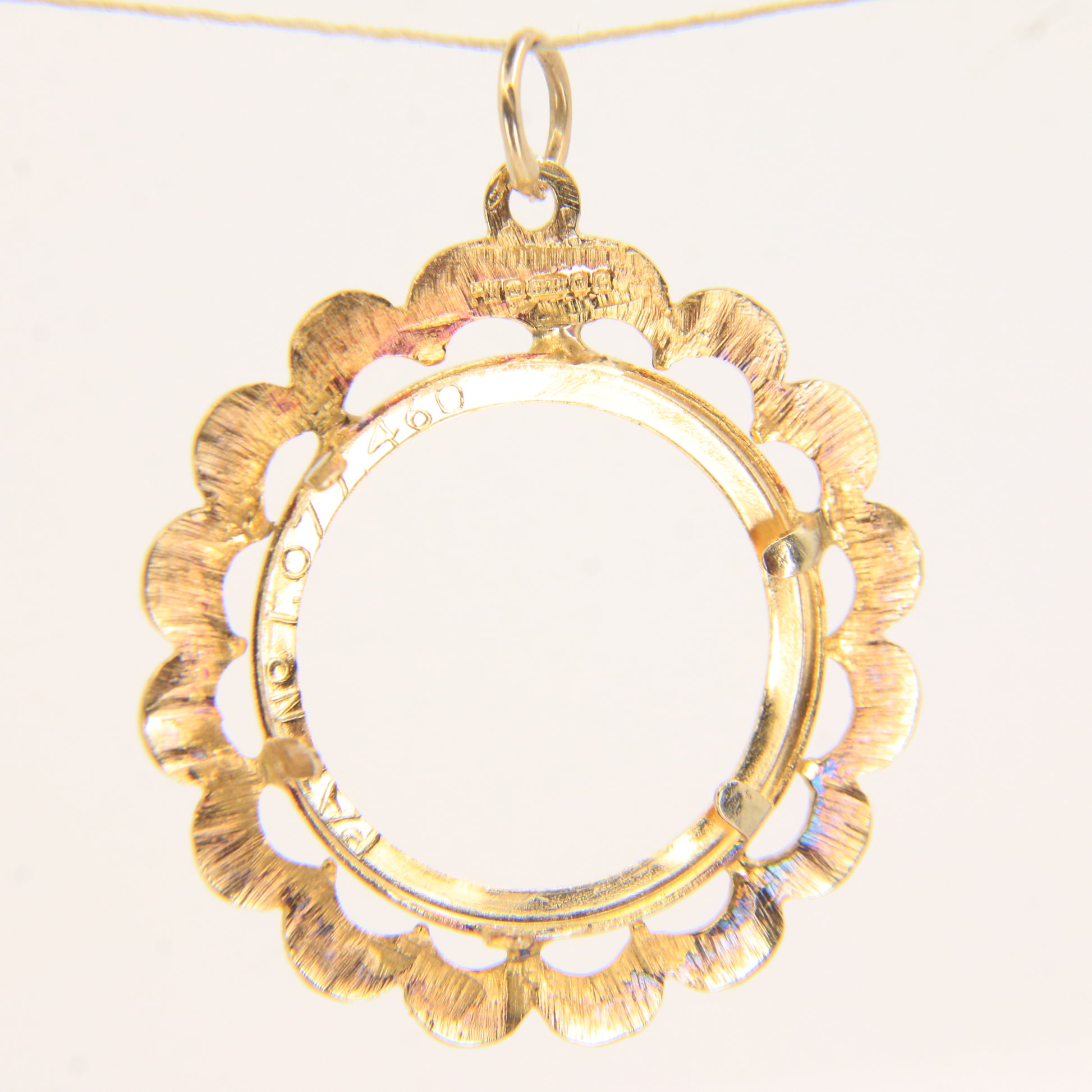 A vintage 9ct yellow gold hallmarked pendant mount designed to hold a half sovereign coin. Finished with a decorative edge, it makes a timeless addition to any collection or a thoughtful gift. Add this versatile piece to your jewellery today.