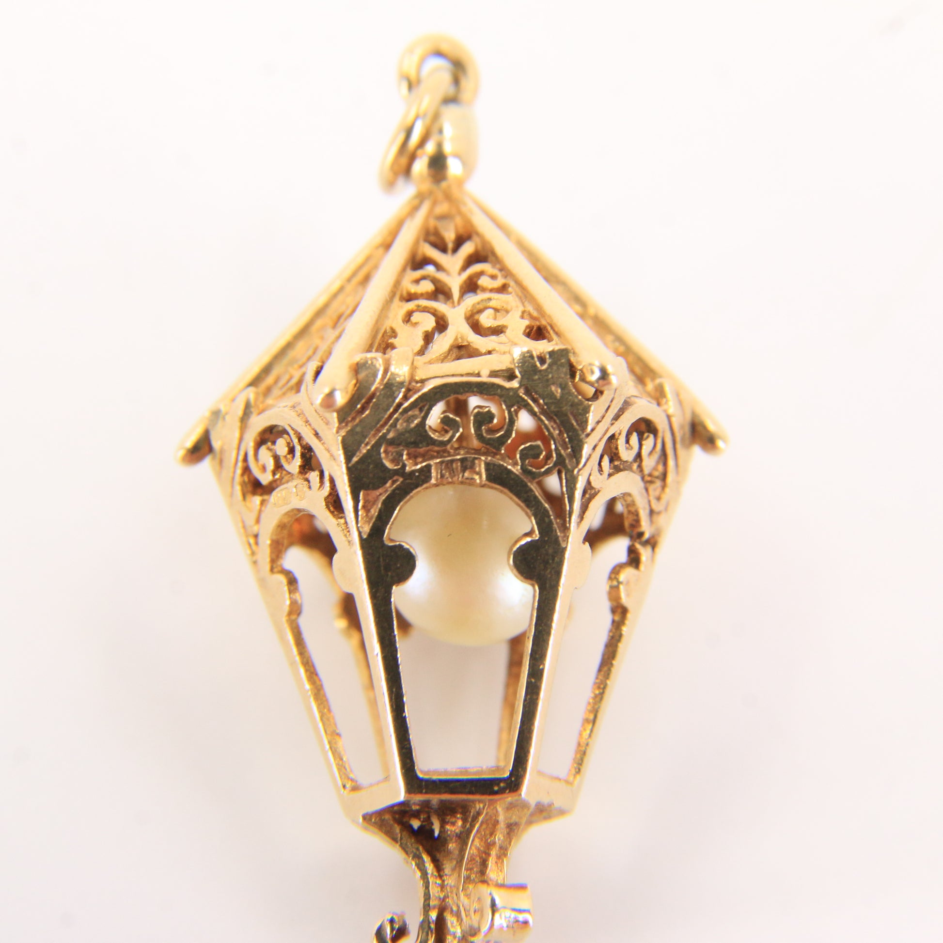 A beautiful vintage 9ct gold lantern pendant with an ornate filigree frame and a single pearl suspended inside. A charming and elegant piece, perfect as a pendant or addition to a charm bracelet. Add this to your collection today.