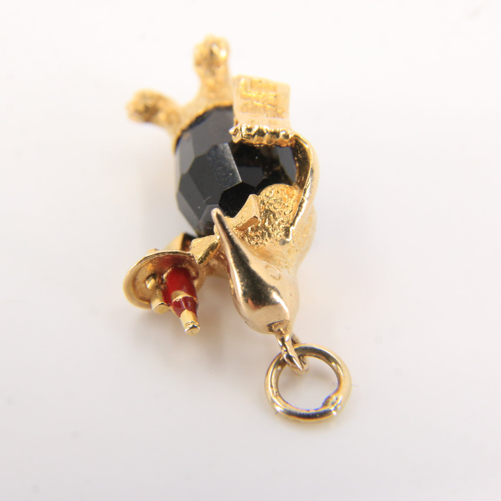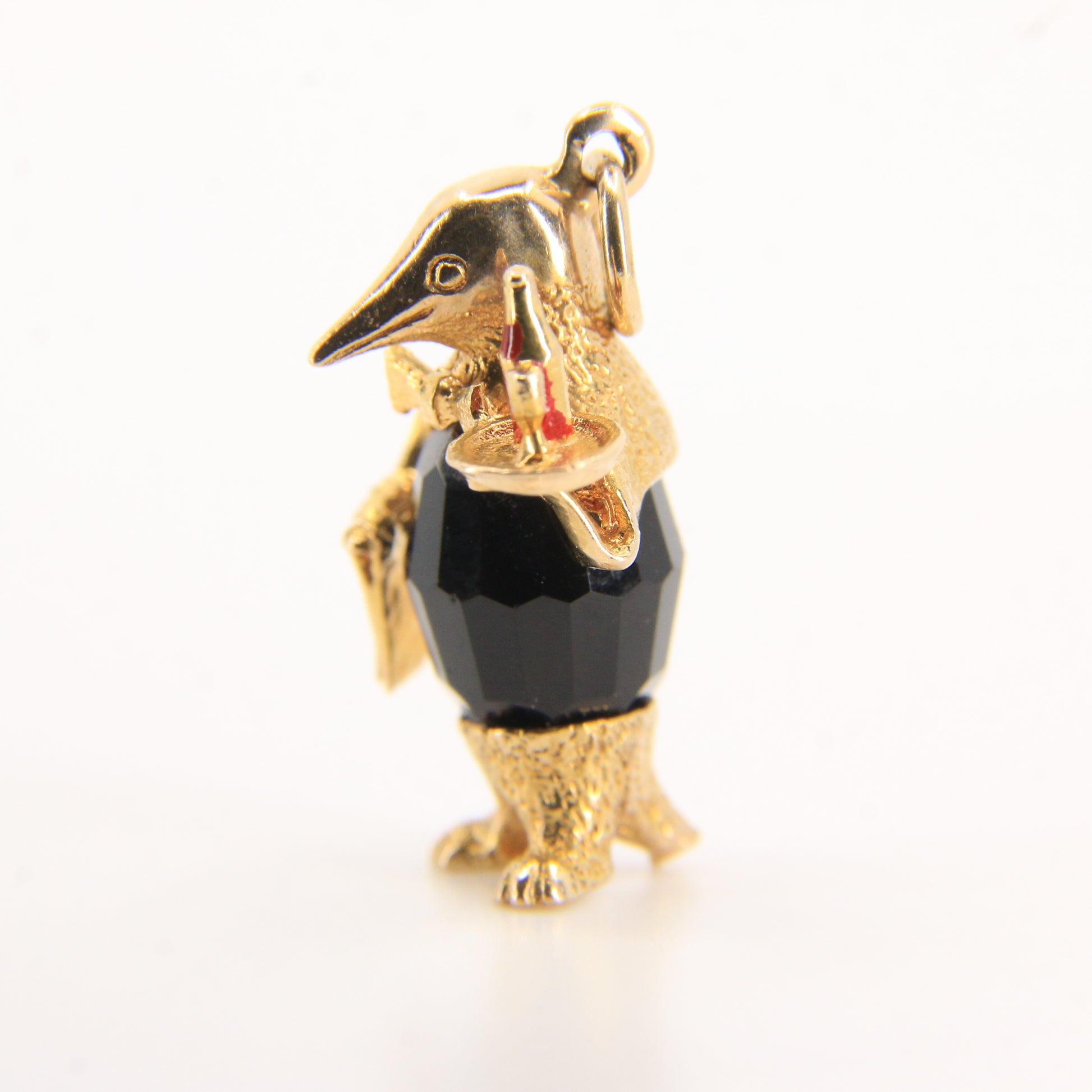 A charming vintage 9ct hallmarked gold penguin butler pendant, featuring a faceted black body and miniature tray detail with enamel bottle and glasses. A quirky and collectible piece ideal for animal lovers or charm bracelet enthusiasts.