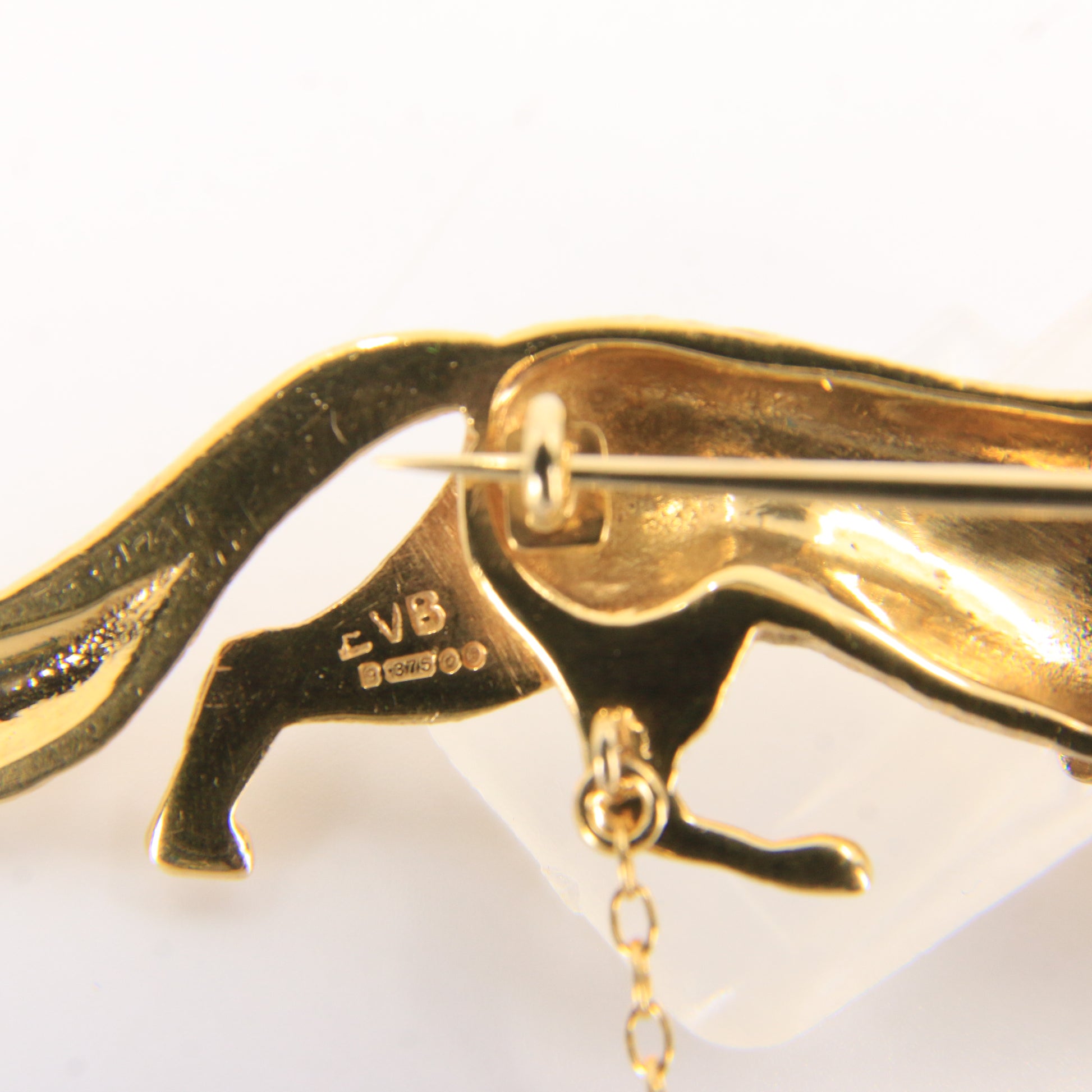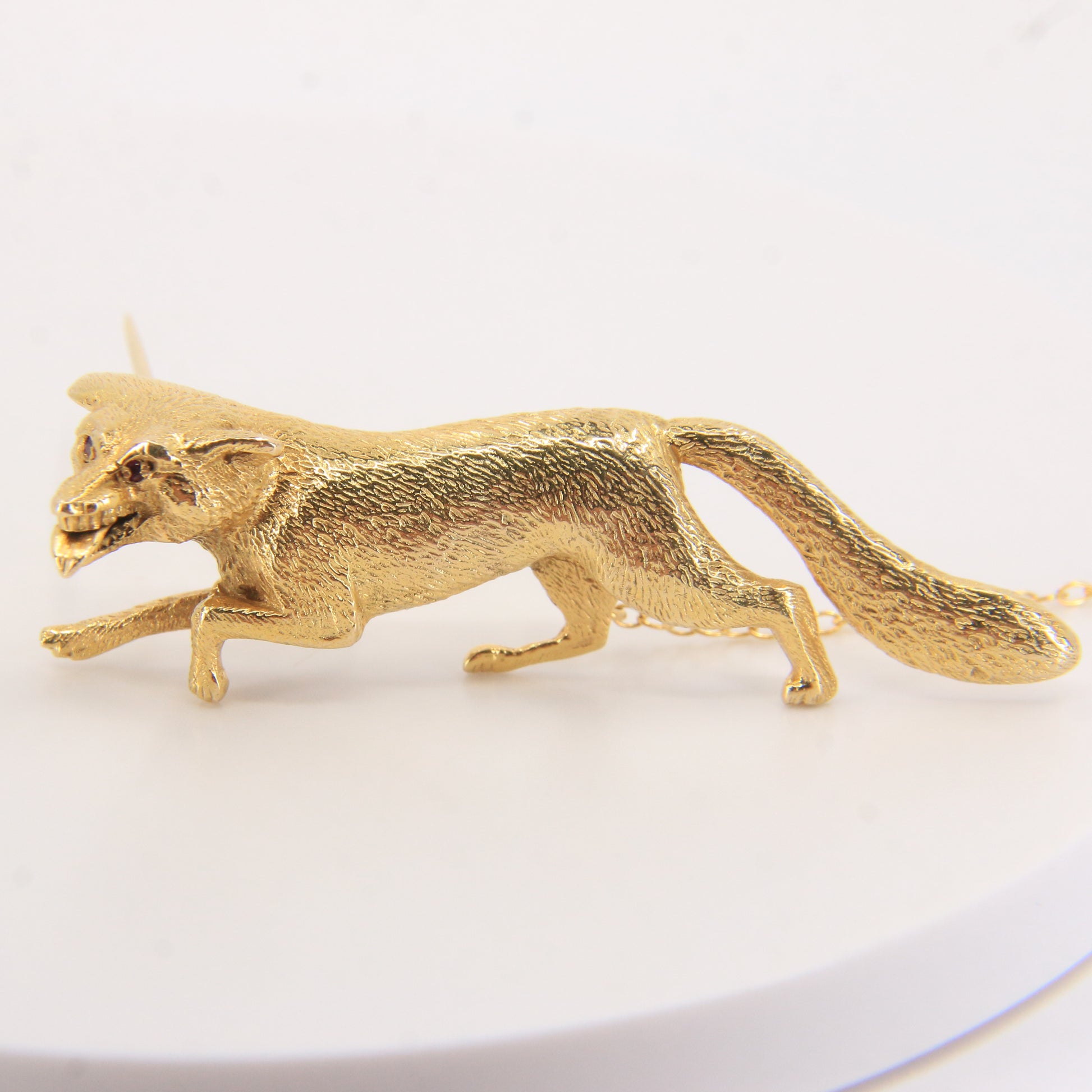 A beautifully sculpted vintage 9ct gold fox brooch from 1969 featuring fine fur detailing and striking ruby set eyes for added character. Foxes have long symbolised cleverness and adaptability in jewellery—add this standout piece to your collection today.