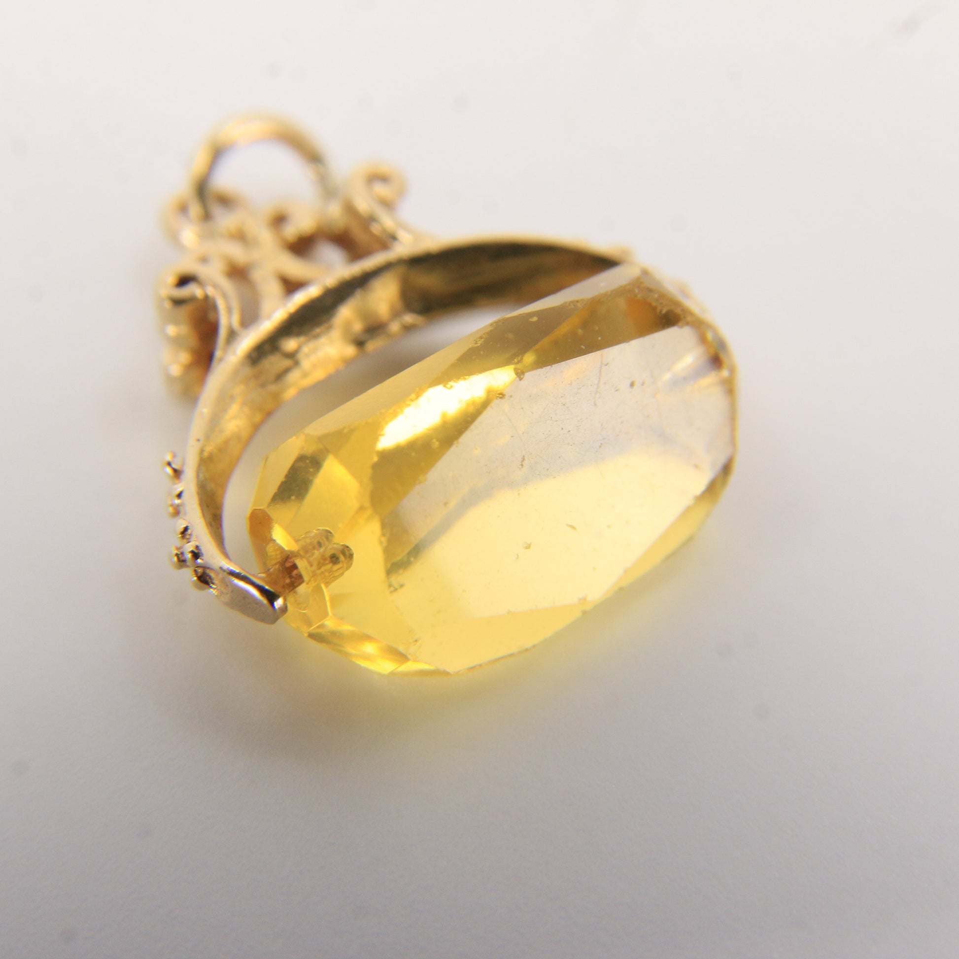 A lovely vintage 9ct gold spinner pendant set with a soft yellow citrine, held in an ornate floral mount. Perfect as a charm or pendant, ideal for collectors and jewellery lovers. Add this to your collection today.