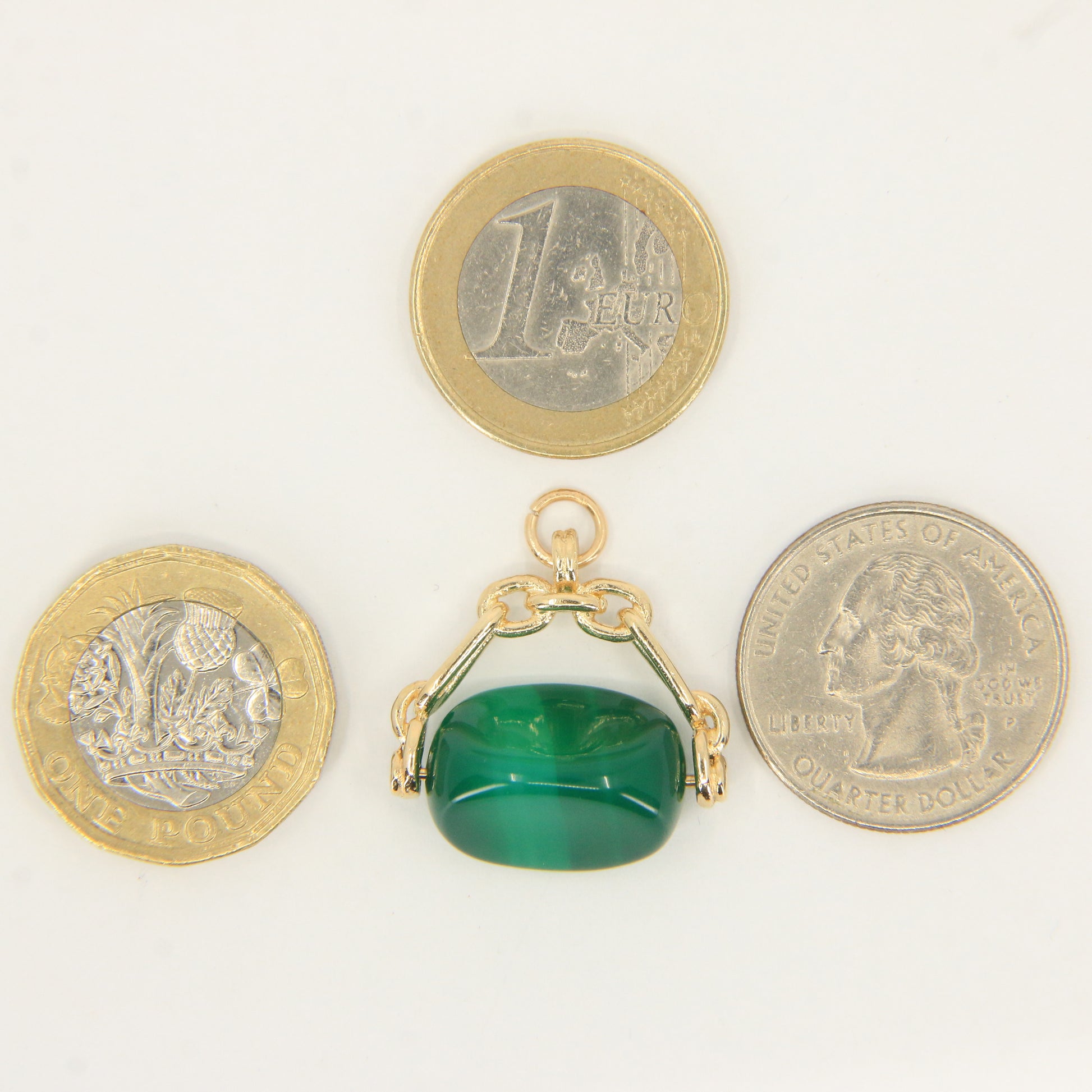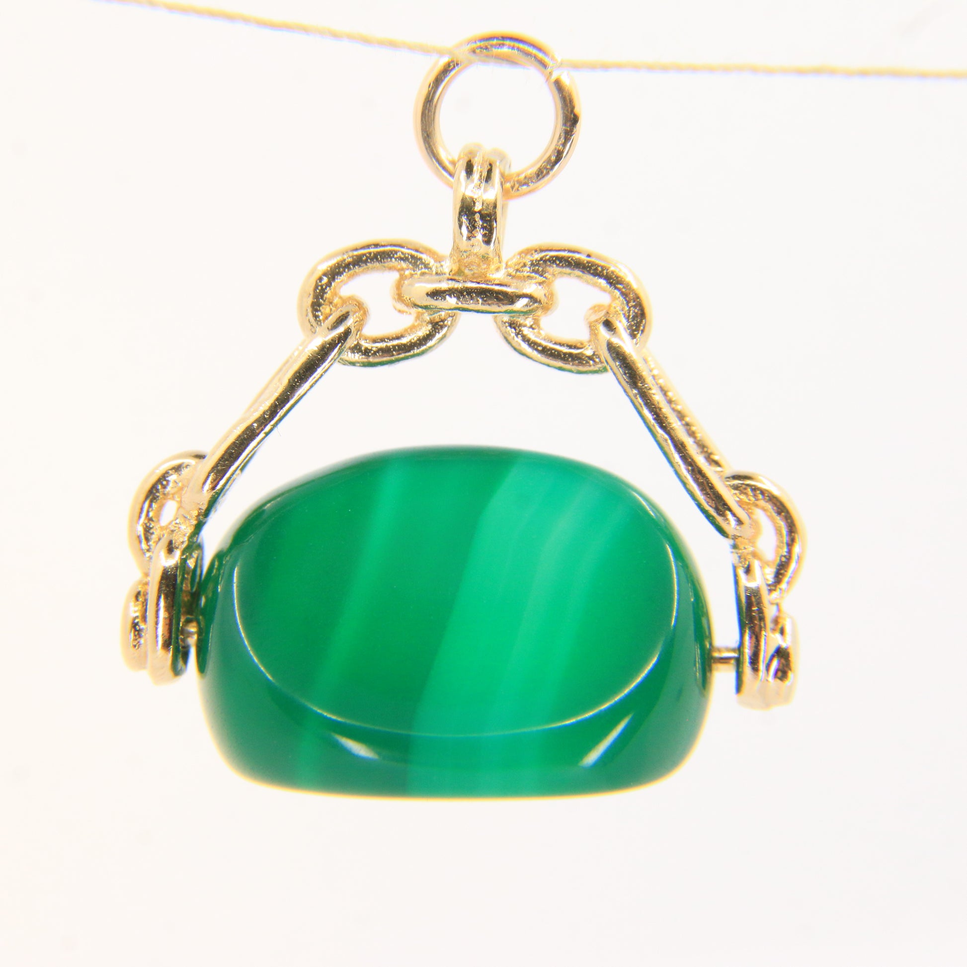 Vintage 9ct hallmarked yellow gold spinner pendant set with striking banded green malachite. A distinctive gift for a watch chain or stylish pendant for daily wear.