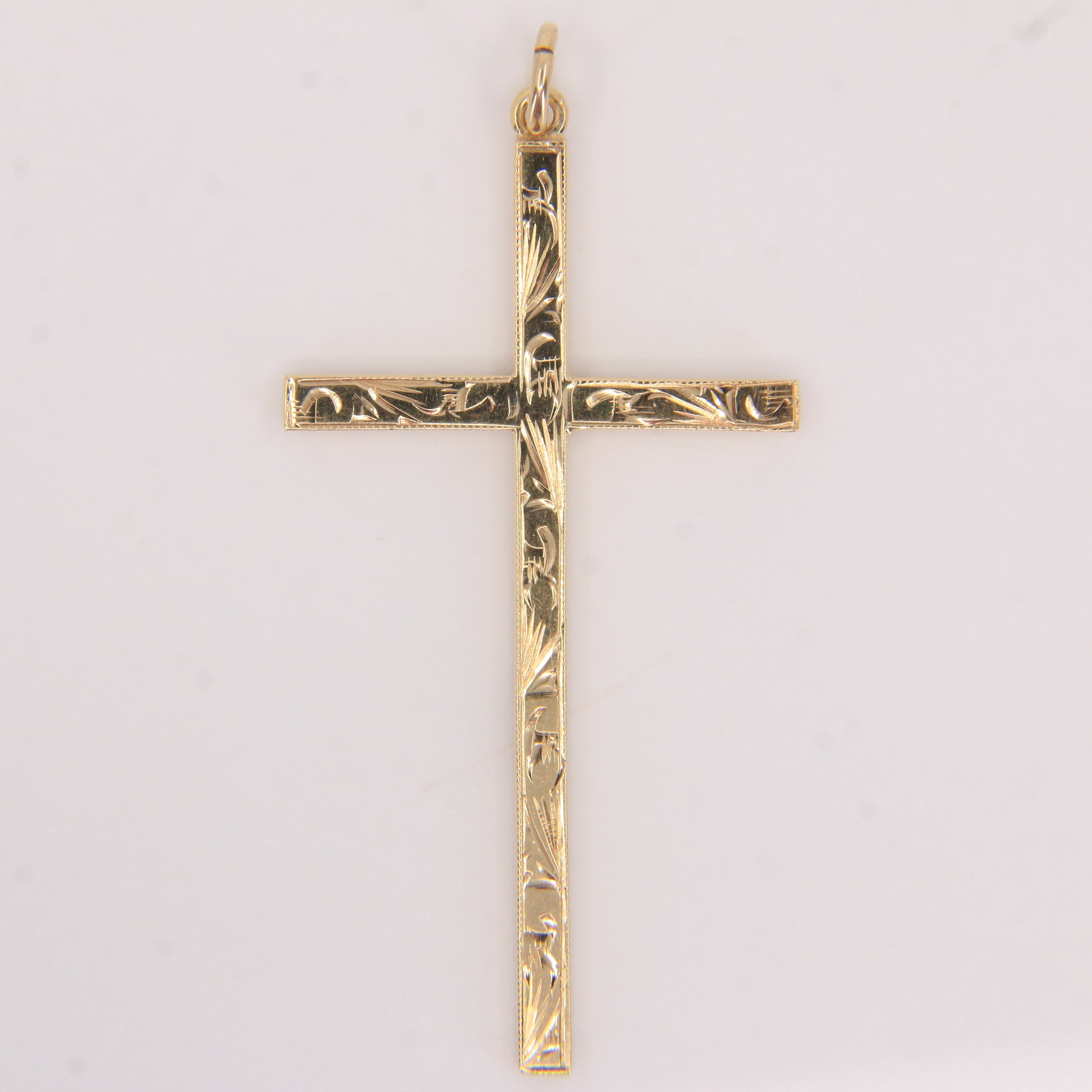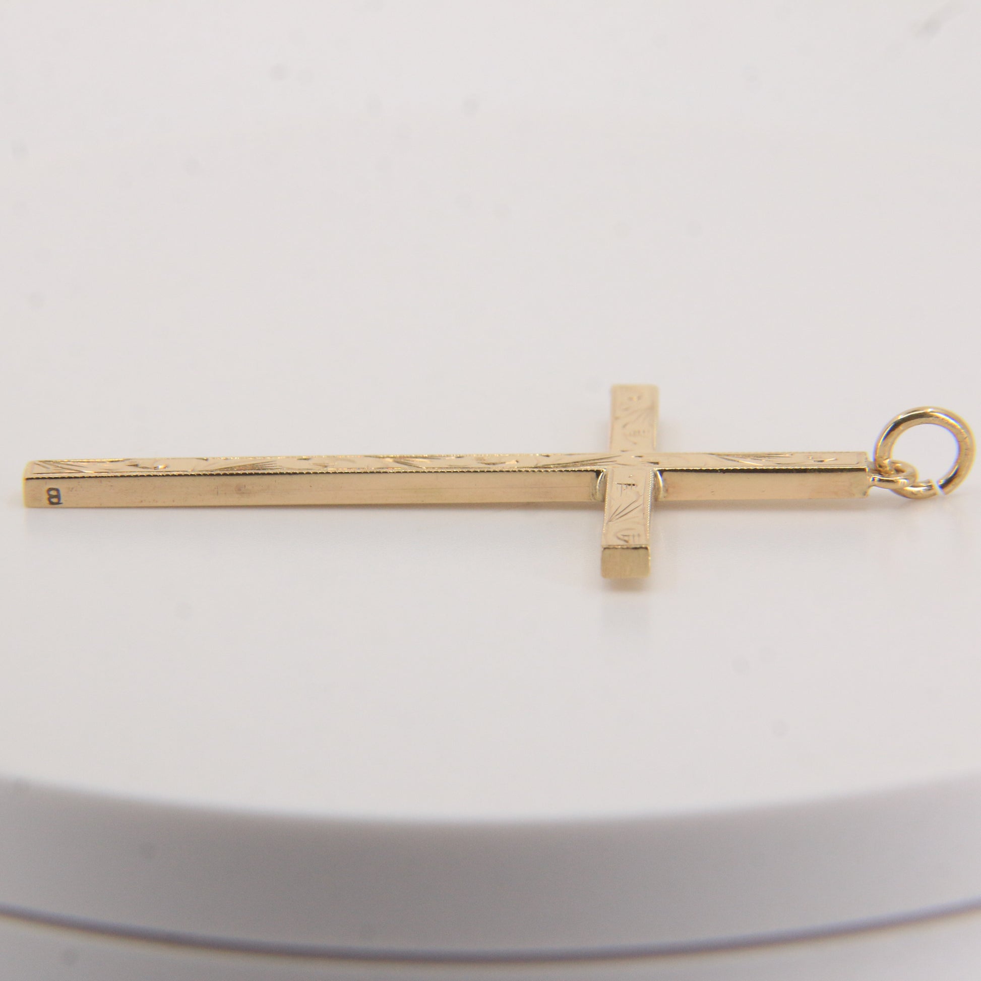 This vintage 9ct hallmarked yellow gold cross features fine engraved detailing along each arm, giving it a classic and elegant appearance. A timeless religious pendant that works beautifully on any chain. Add this to your collection today.