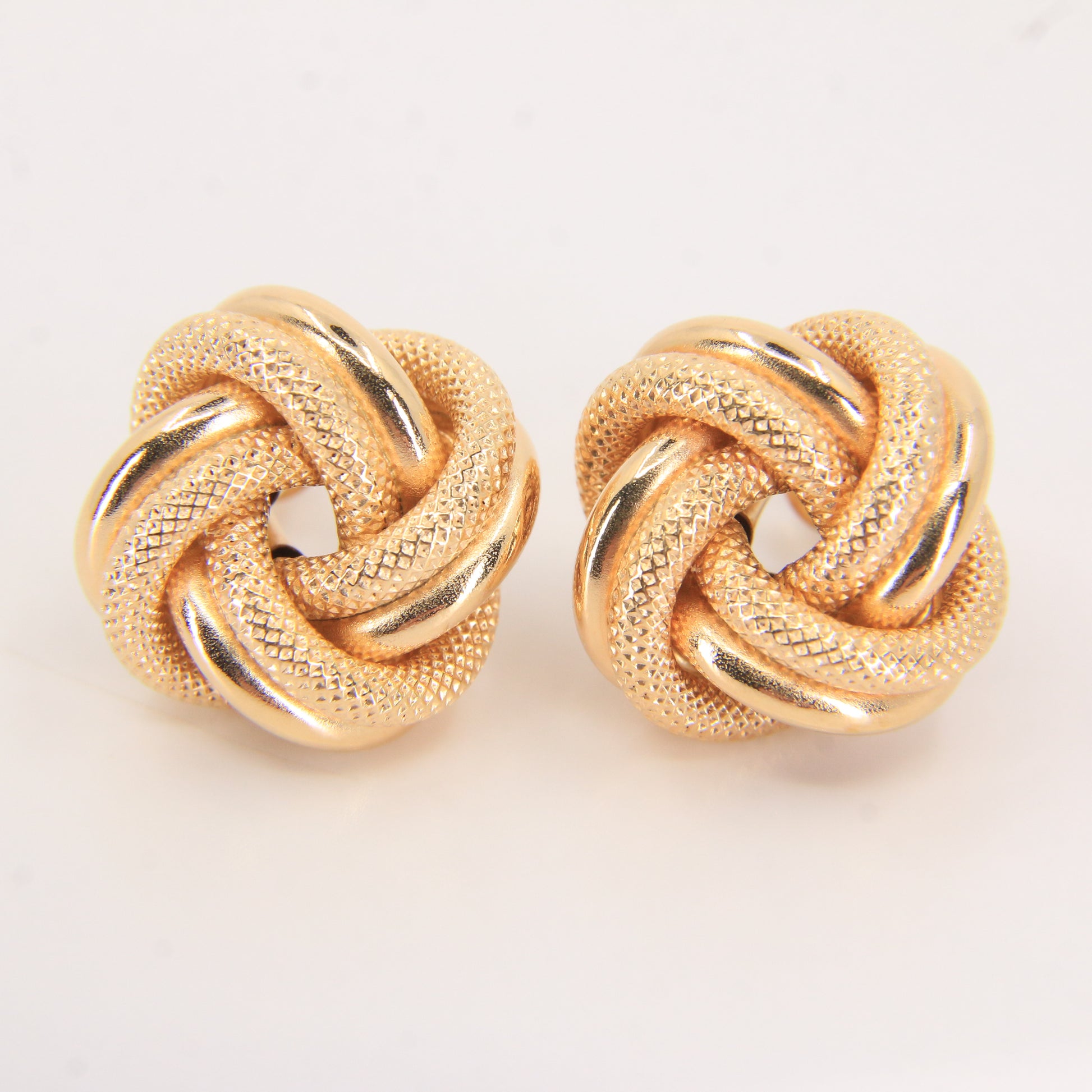 Vintage 9ct hallmarked yellow gold knot stud earrings with a detailed textured finish woven through a polished gold design. A classic, solid pair that sit neatly on the ear and fasten securely with butterfly backs. Supplied boxed and ready to gift — add these to your collection today.