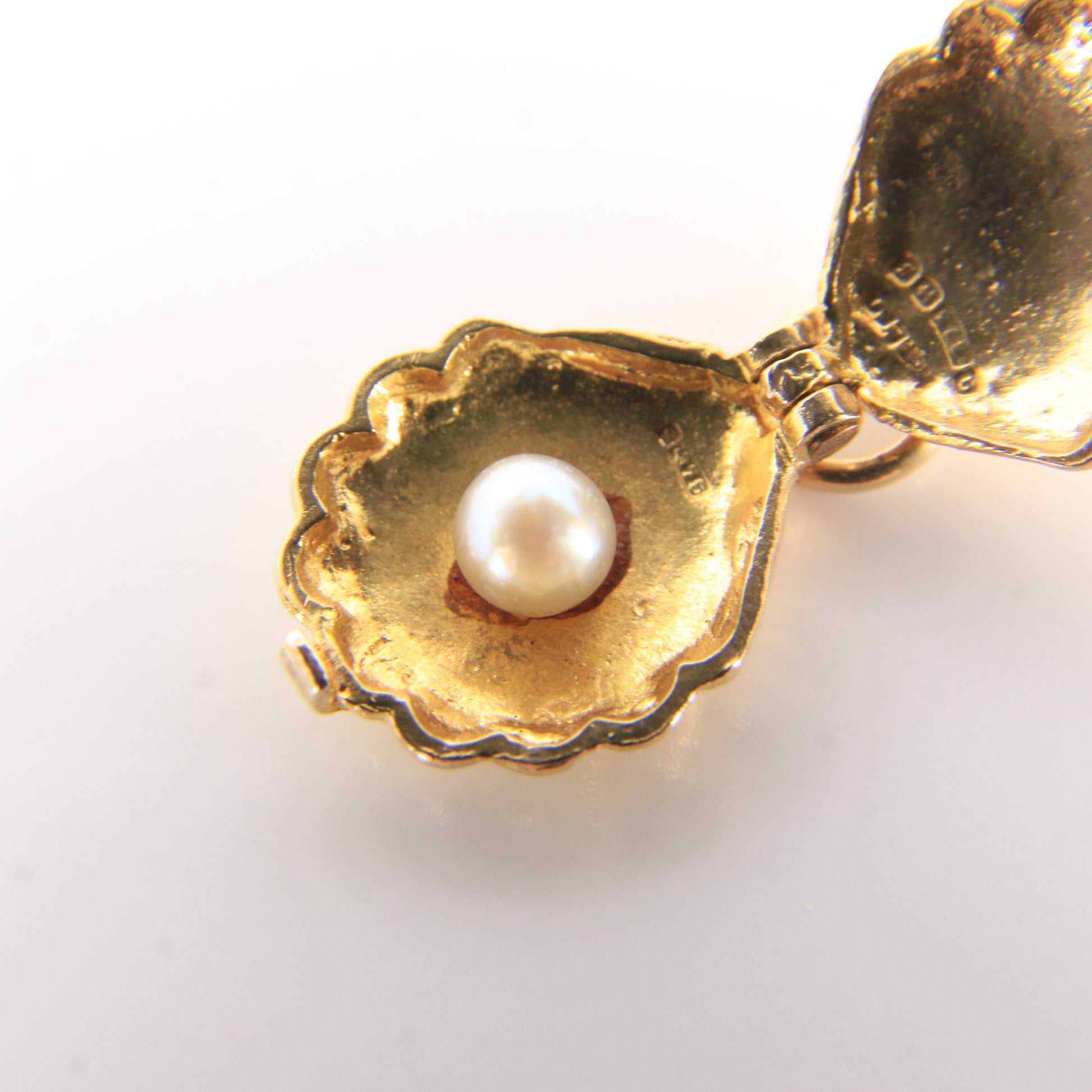A charming vintage opening clam pendant crafted in 9ct gold, fully hallmarked and revealing a delicate pearl within. A playful yet elegant piece with lovely movement and detail—add this to your collection today.