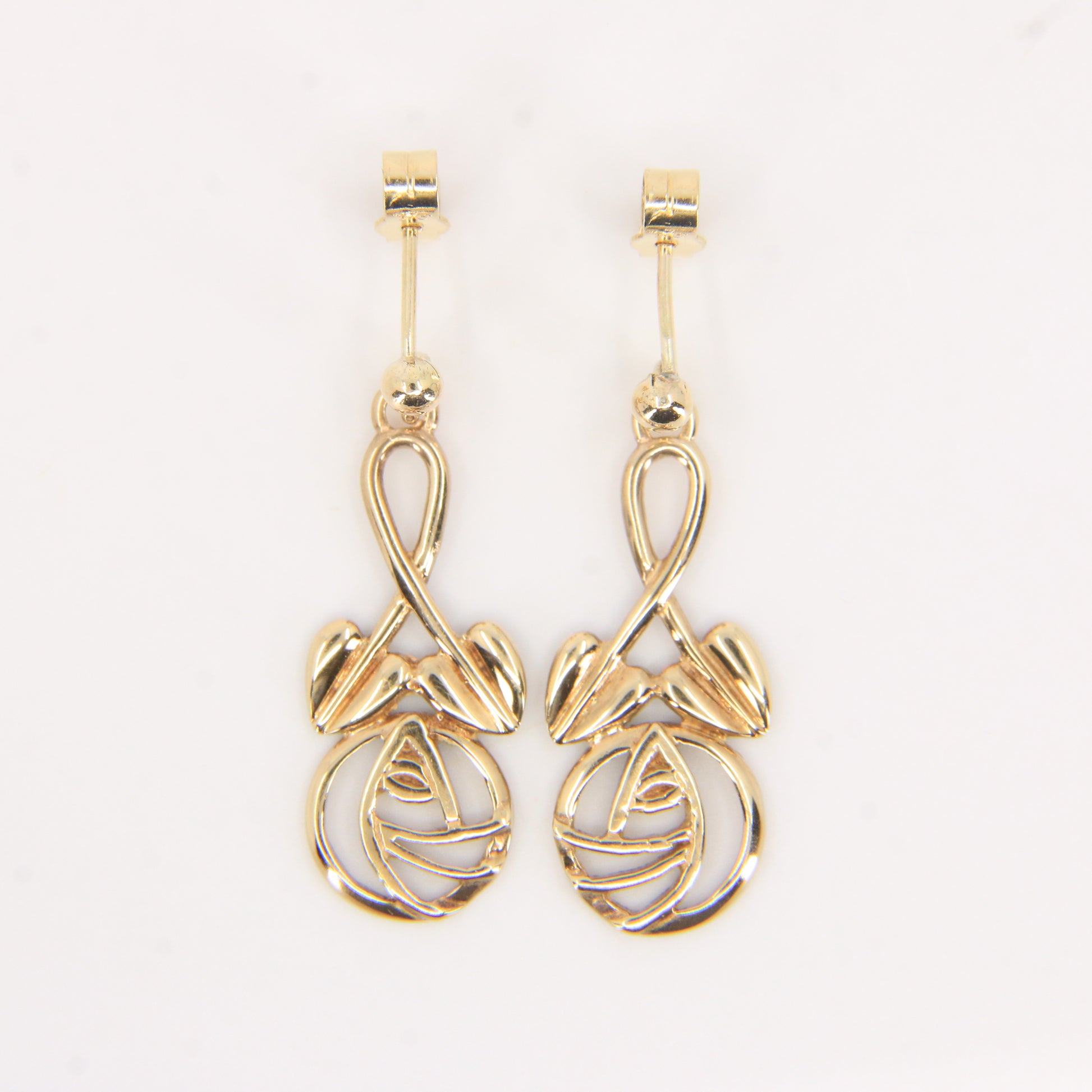 Vintage 9ct hallmarked yellow gold Rennie Mackintosh style drop earrings with flowing Art Nouveau lines and openwork detail. A lightweight, elegant pair that move nicely when worn and fasten securely with stud backs. Supplied boxed and ready to gift — add these to your collection today.