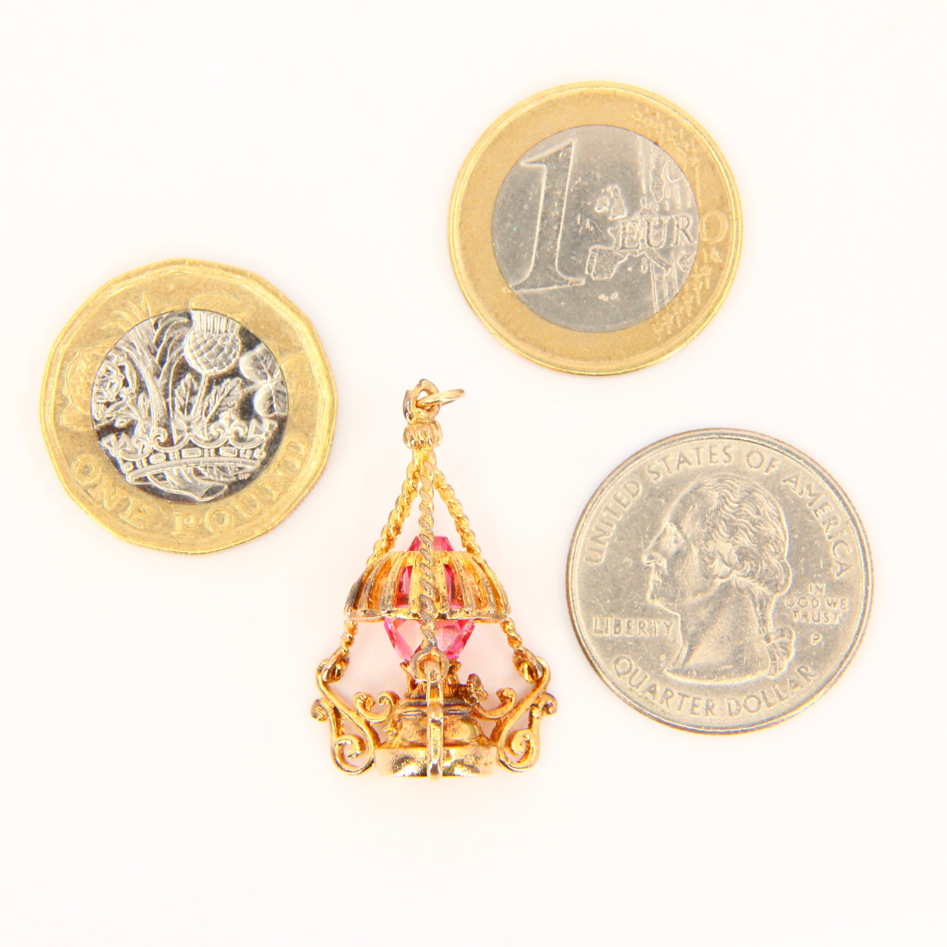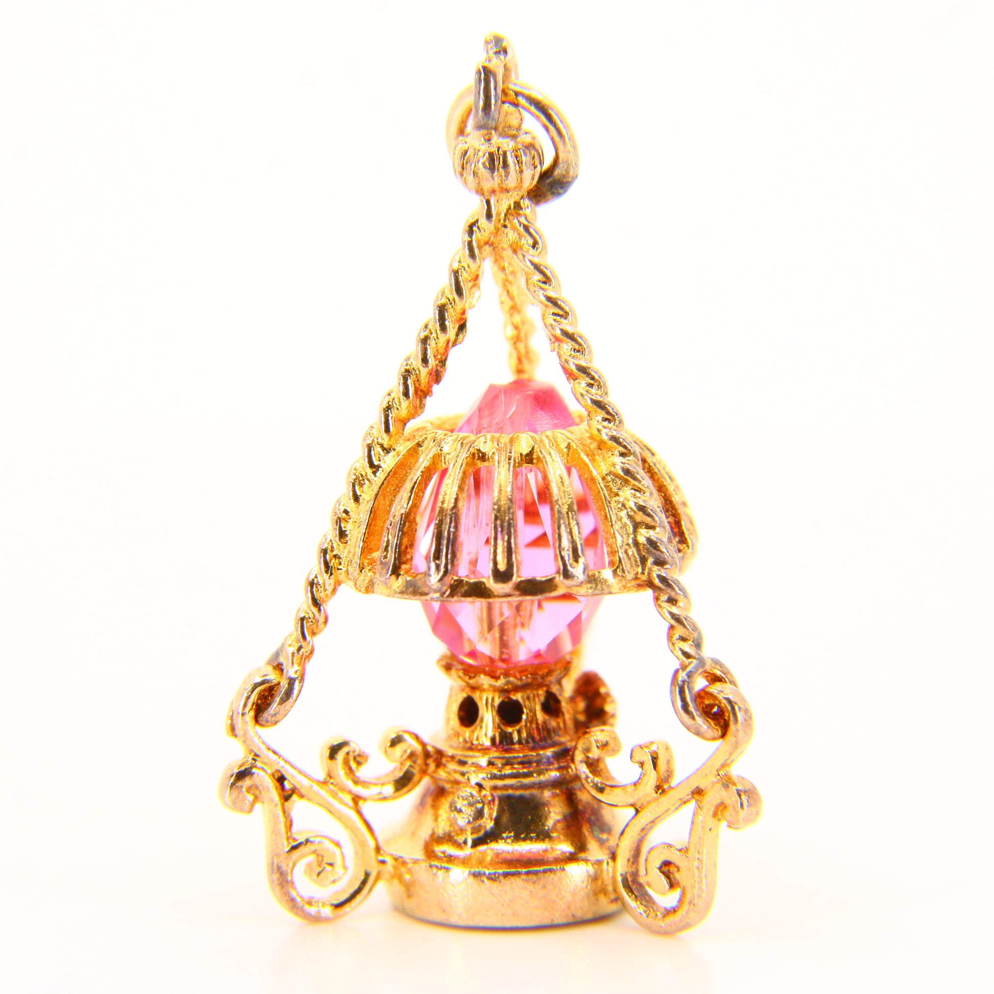Vintage 9ct Pink Crystal Lantern Pendant Hallmarked Solid Gold 3D Oil Lamp Charm