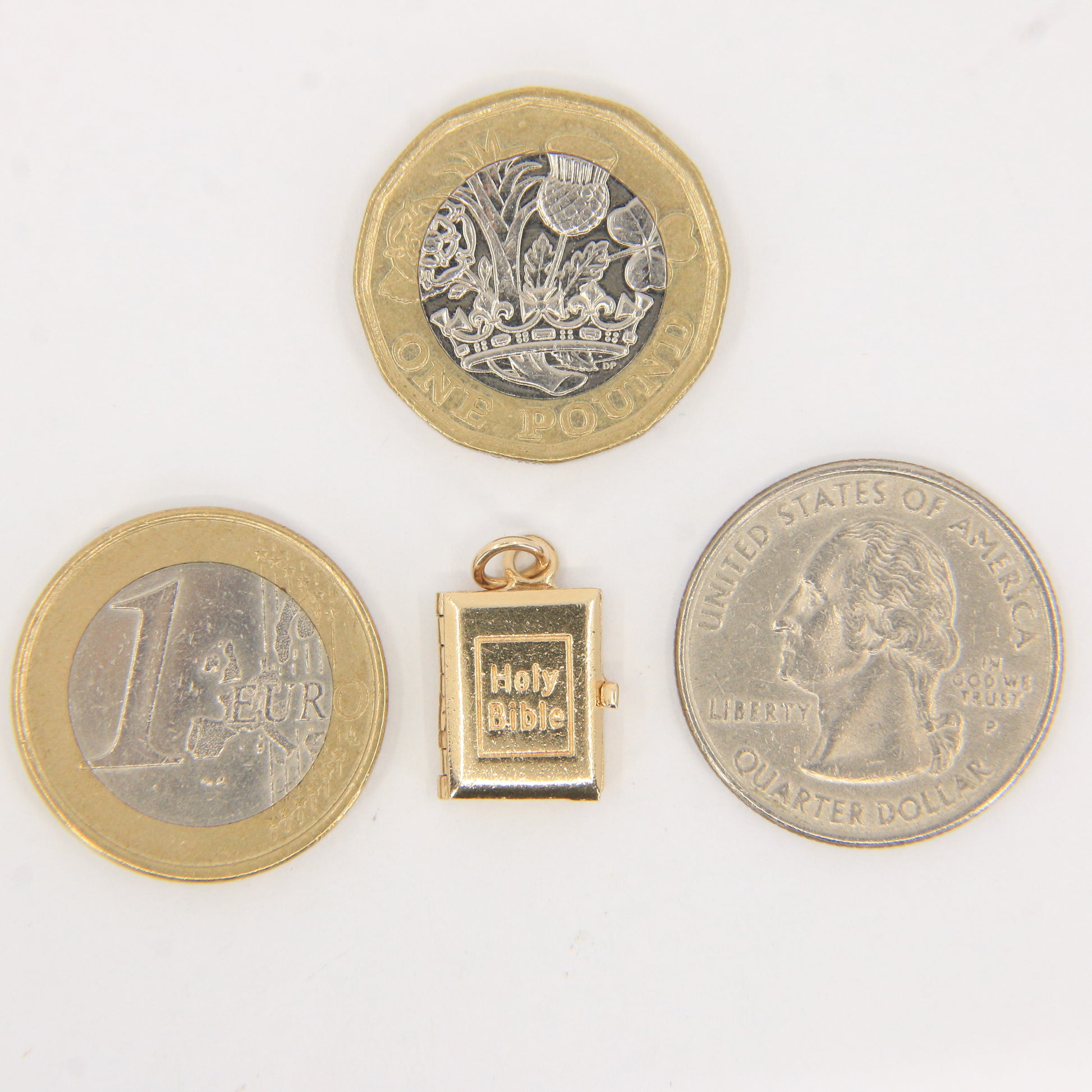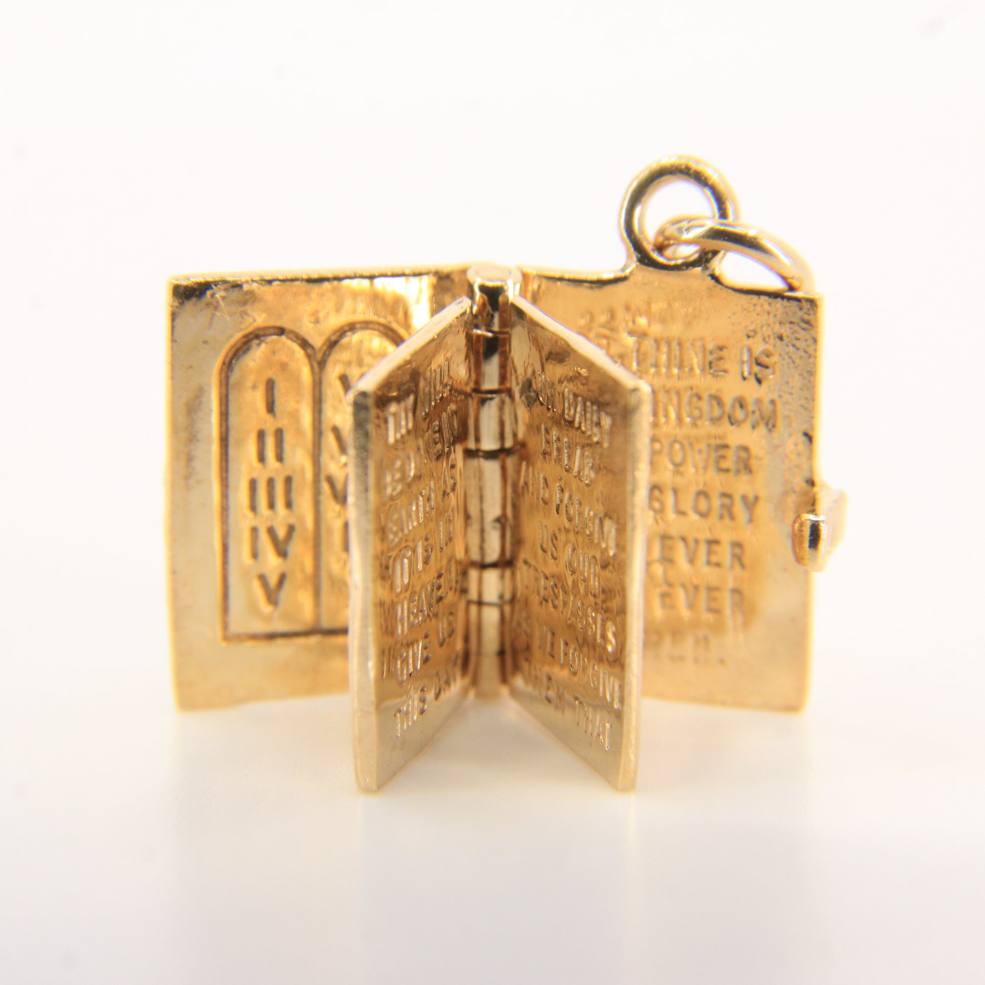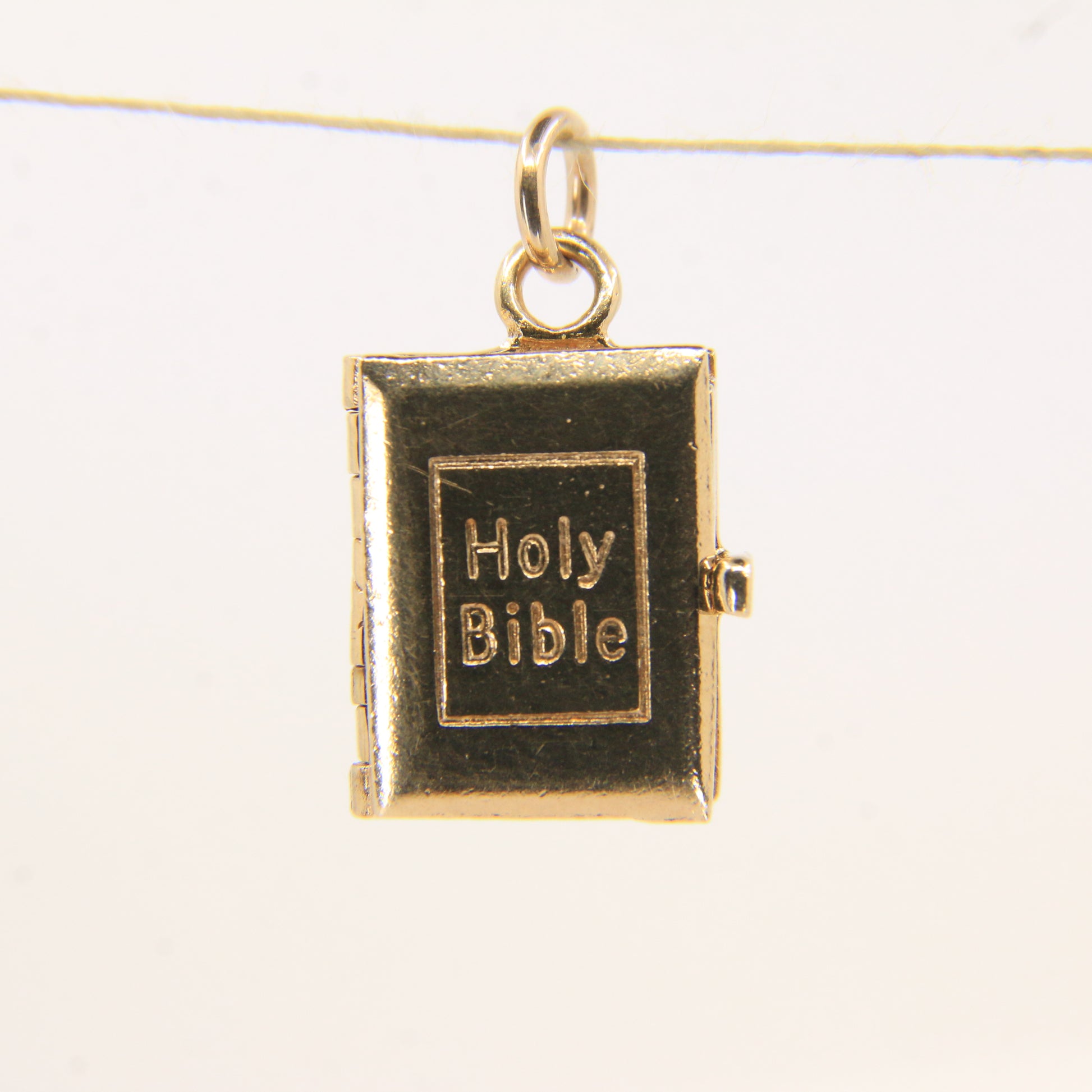 Vintage 9ct solid gold opening Bible charm featuring engraved pages with detailed inscriptions and a hinged design. A meaningful keepsake or perfect gift for a loved one.