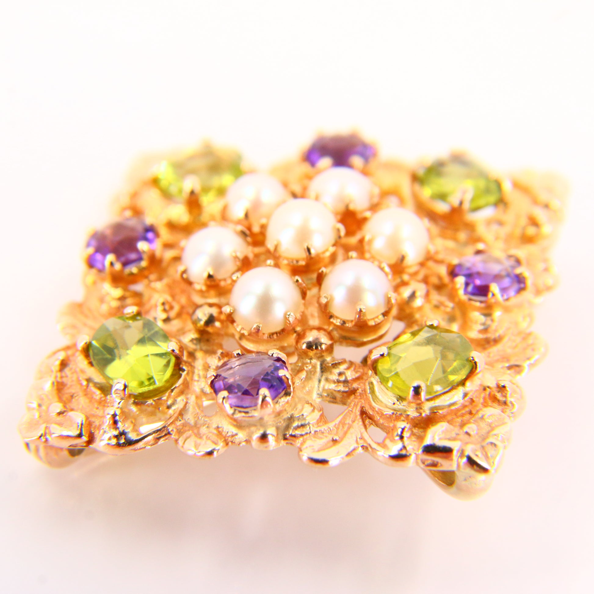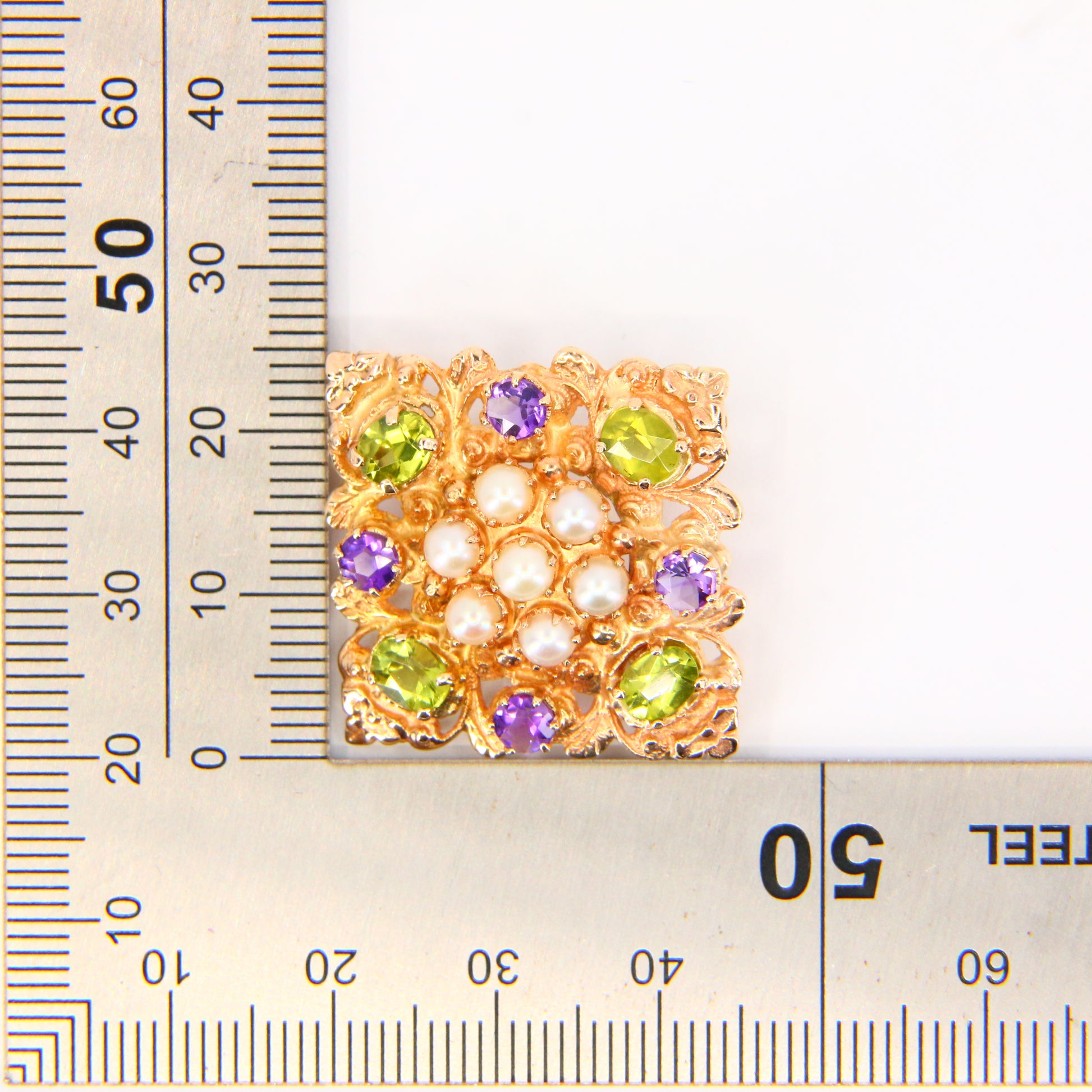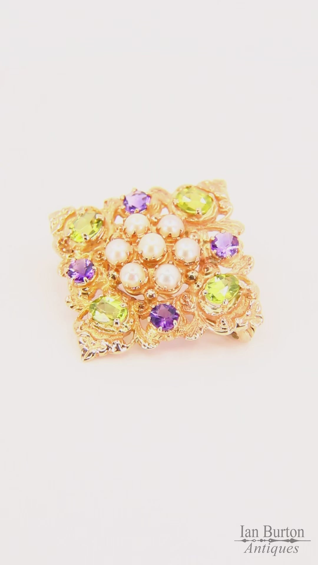 Vintage 9ct Suffragette Brooch Peridot Amethyst & Seed Pearl Hallmarked Yellow Gold Boxed