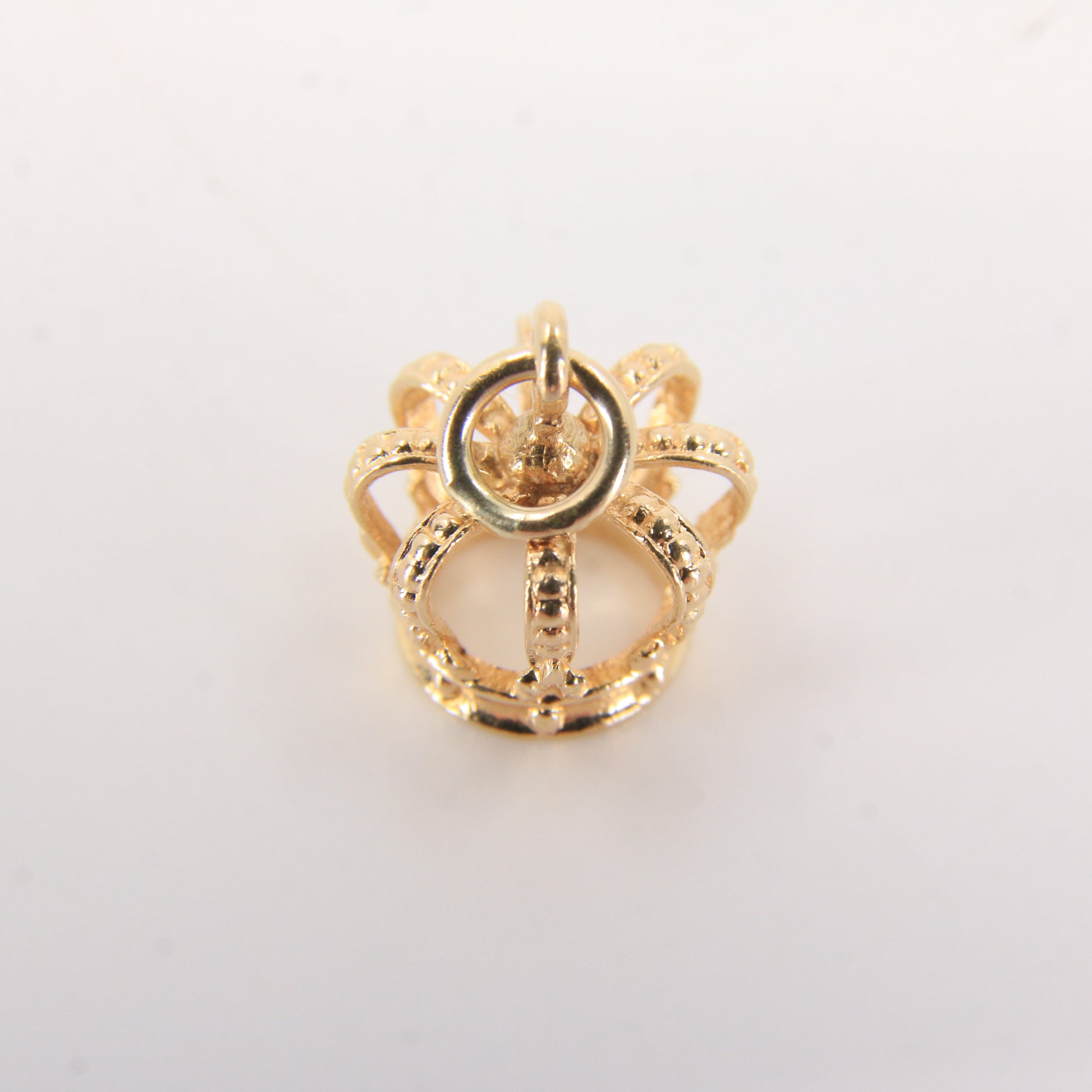 A vintage 9ct yellow gold crown charm pendant, finely modelled with raised detail and a polished finish throughout. Crown motifs traditionally symbolise power, status, and good fortune, making this a classic and meaningful charm—add it to your collection today.